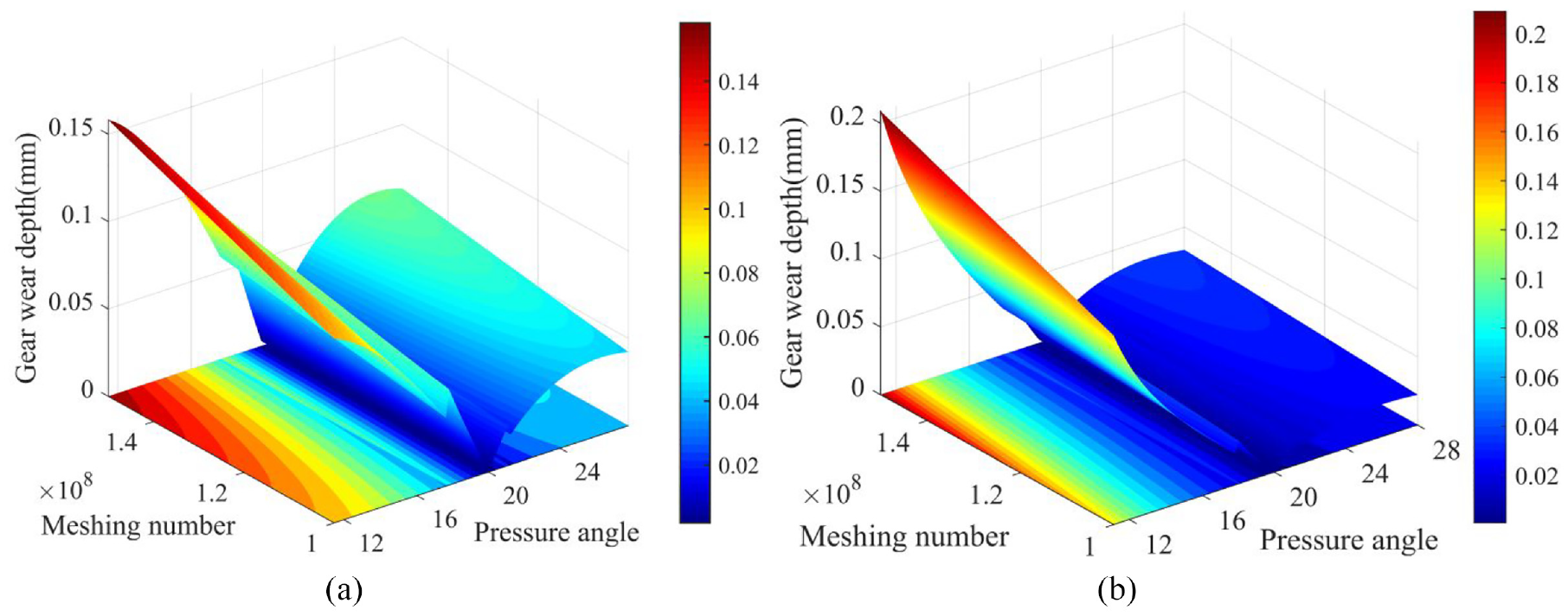 The wear depth of the internal meshing: (a) planet gear wear situation and (b) ring gear wear situation.
