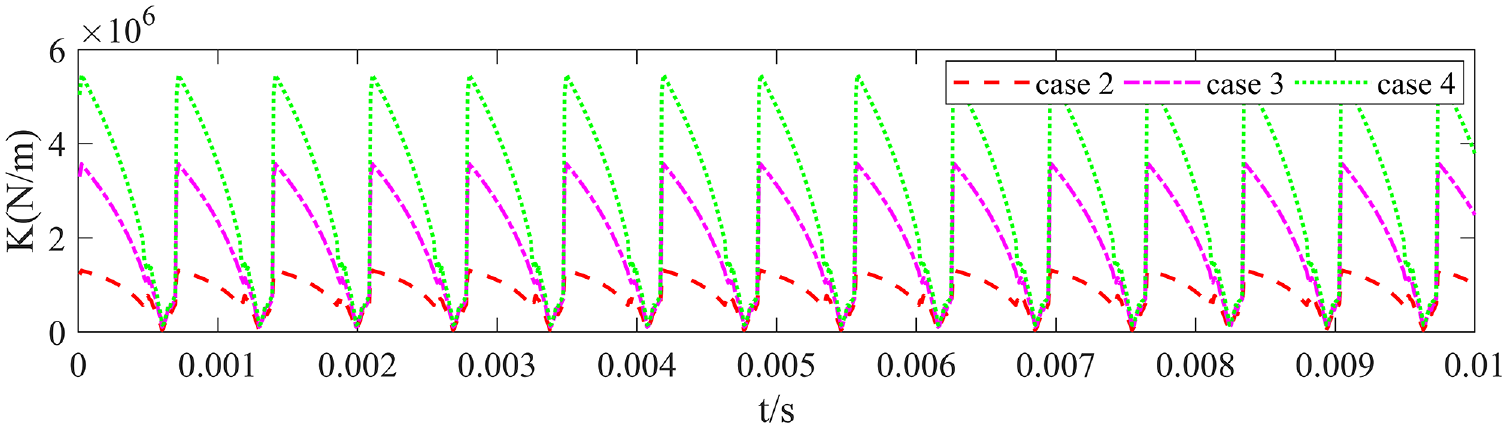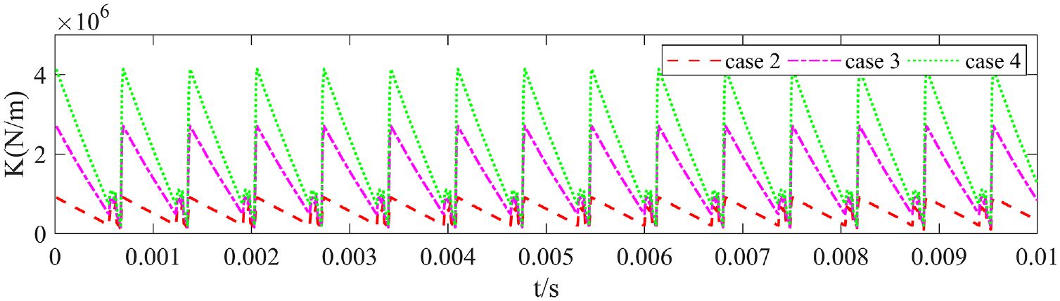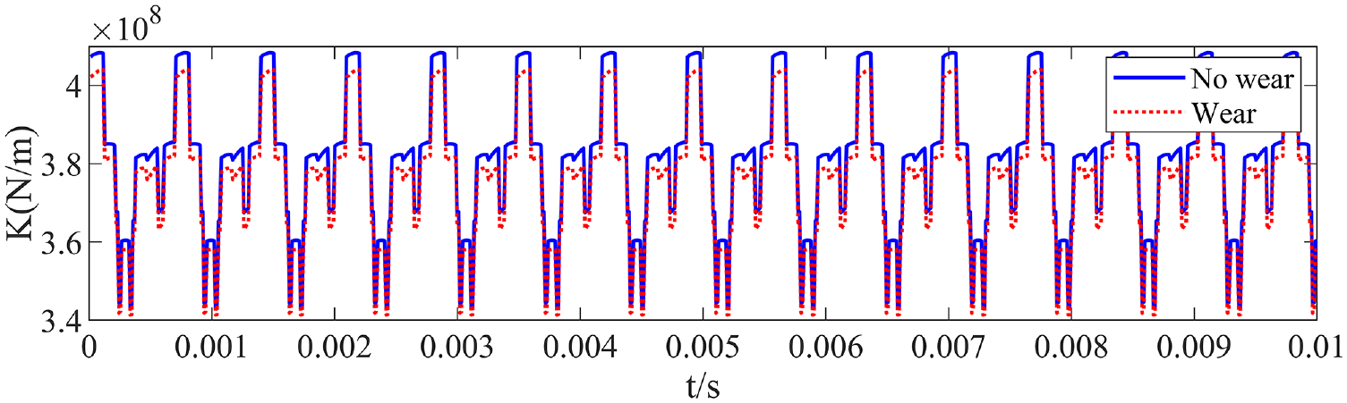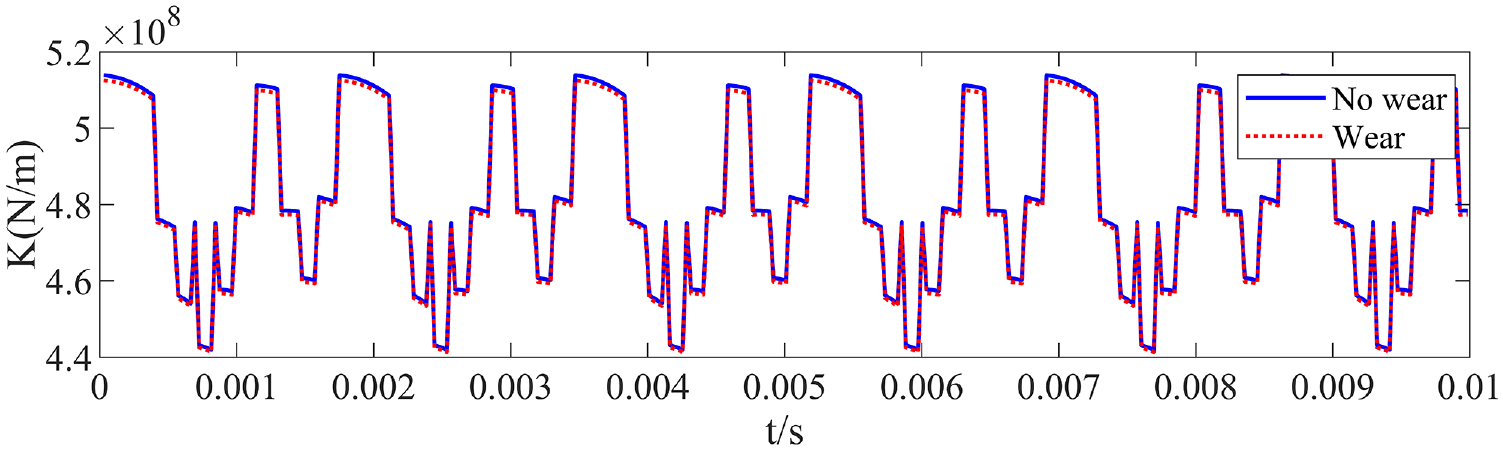 In the Figure 19, wear can reduce gear mesh stiffness, the effect of wear on internal meshing is relatively small. The calculation formula for the flexible stiffness taking into account wear is as follows.