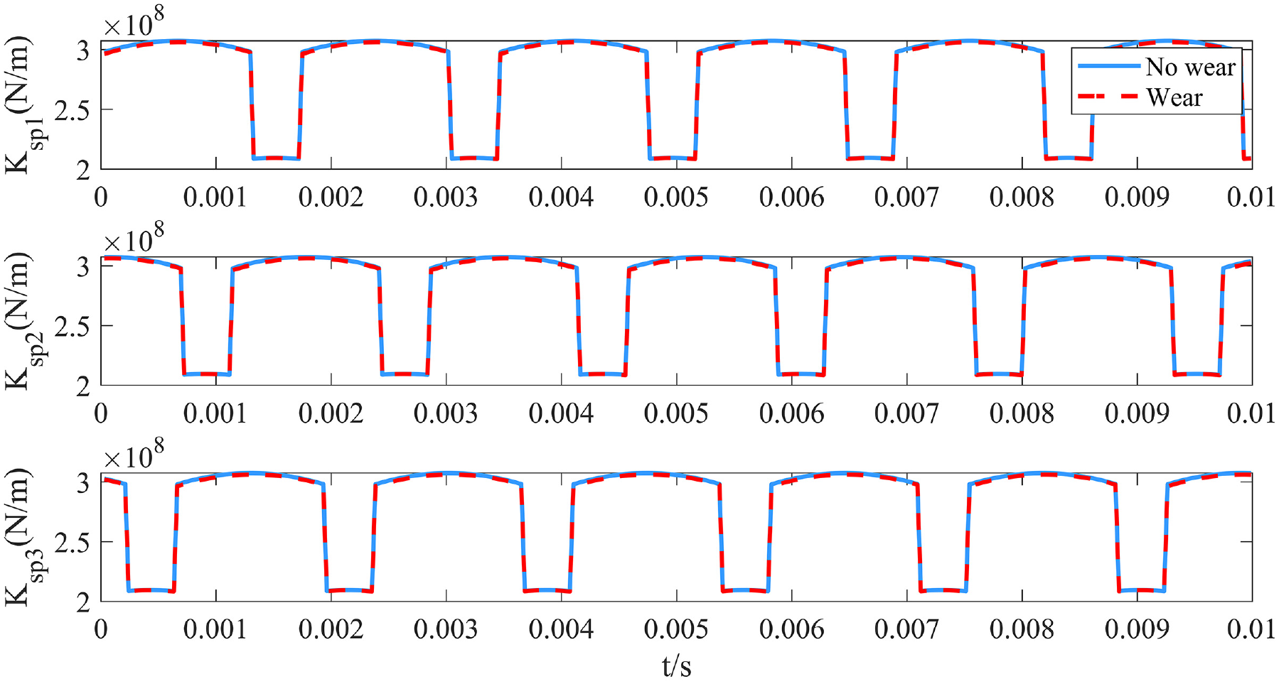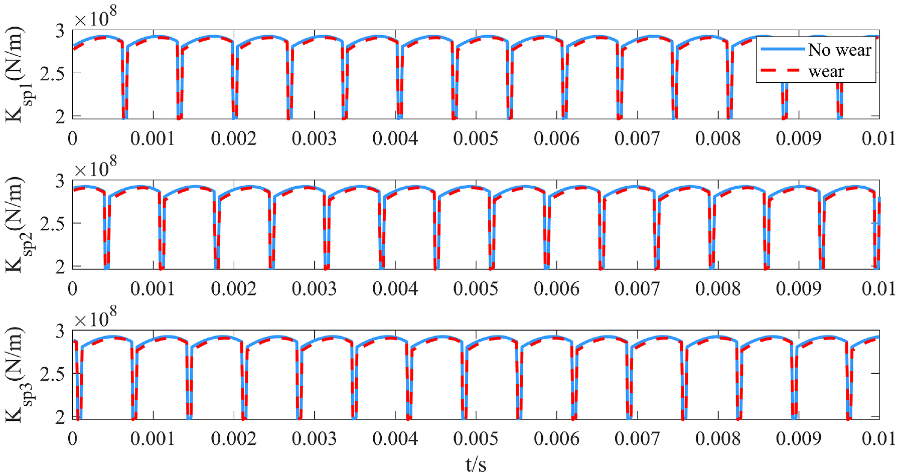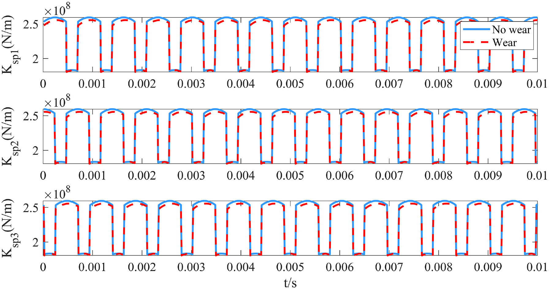In the Figure 19, wear can reduce gear mesh stiffness, the effect of wear on internal meshing is relatively small. The calculation formula for the flexible stiffness taking into account wear is as follows.