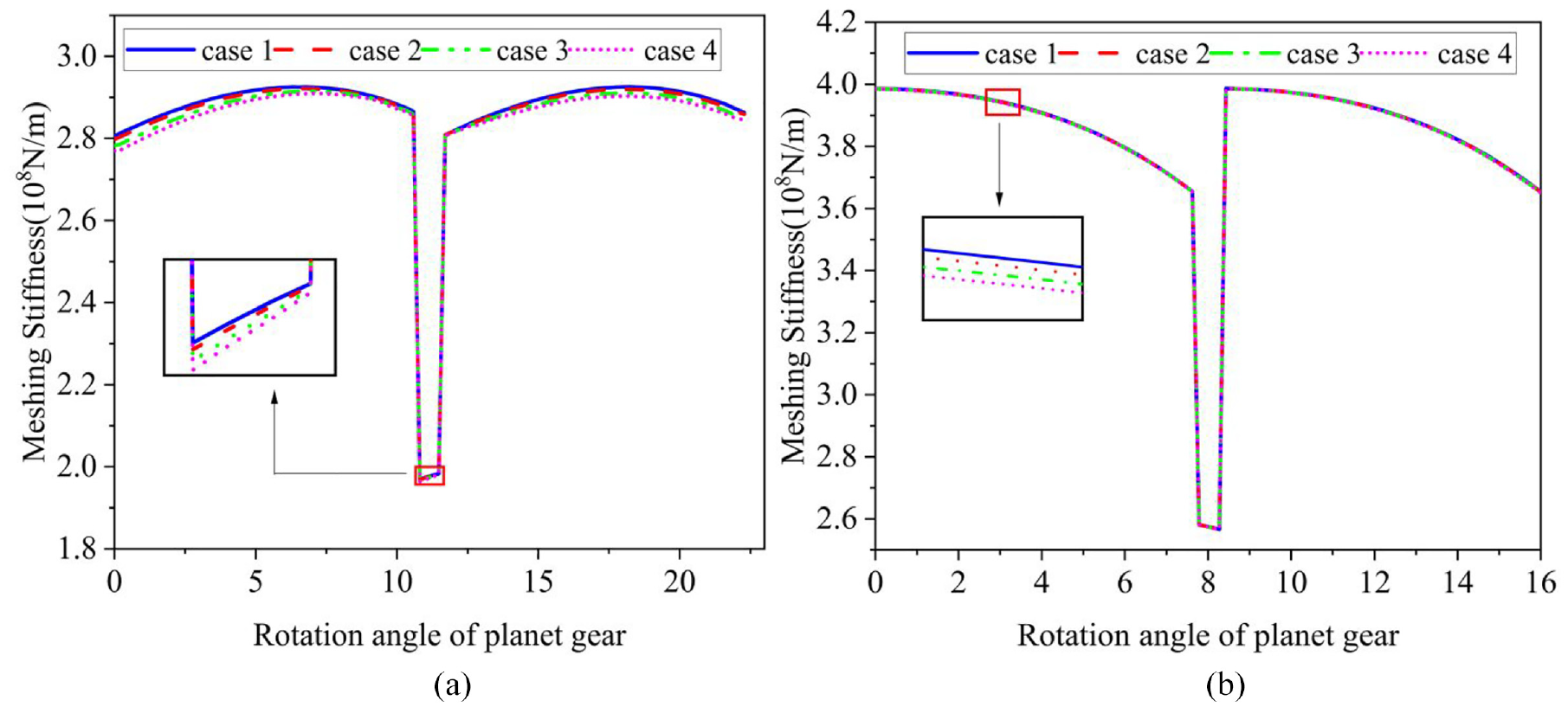 The overall stiffness of planetary gear train: (a) first stage and (b) second stage.