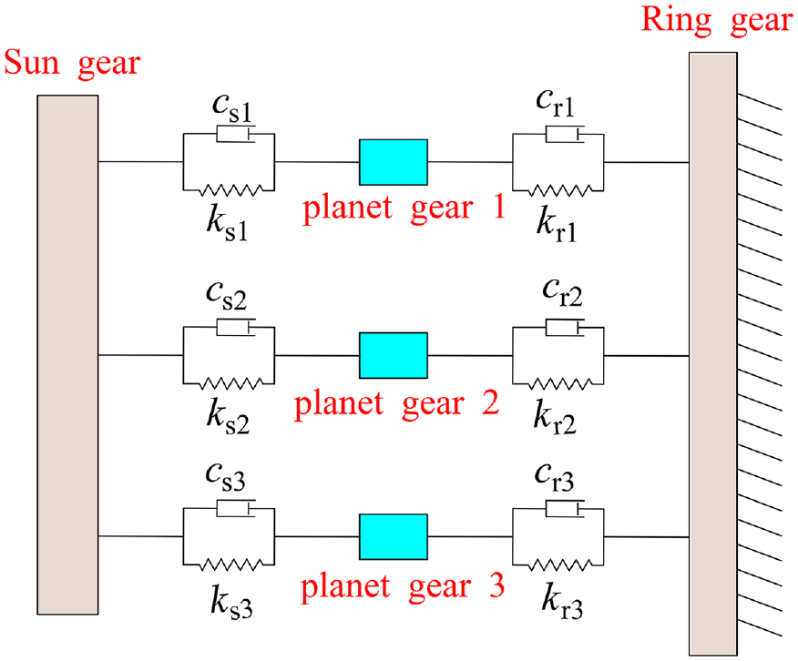 Mesh stiffness and tooth shape error, which are internal excitation sources of gears, can cause changes in dynamic behavior. But the stiffness excitation is the most critical. Due to the simultaneous engagement of sun gear, ring gear, and planet gear, it can be transformed into a spring oscillator structure as shown in Figure 25. And synthetic stiffness model is established, which is regarded as a series relationship. The formula for calculating synthetic stiffness comes from this parallel relationship (Figure 26).