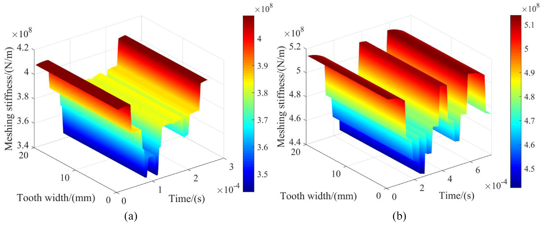 The TVMS of gear is an important parameter of fault dynamics, and the accurate solution of TVMS is of great significance for solving the dynamic behavior caused by early faults. Tian 20 Corrected the calculation method of gear meshing stiffness. By considering shear deformations, proposing a new method for calculating TVMS. Sainsot et al. 21 Found the gear body will also produce a certain degree of deformation during the meshing process. He analyzed the deformation caused by the load on the gear. He proposed the calculation formula of the gear body deformation. However, the error of Sainsot’s research on the deformation of the double teeth meshing zone is always large. So the solution to the basal body deformation of the double-teeth toothing region has become a very challenging problem. In 2018, Xie et al.22,23 Proposed a flexible base stiffness calculation principle considering the coupling effect between teeth. The calculation accuracy is further improved. Chen et al. 24 Proposed a nonlinear principle of contact stiffness calculation.