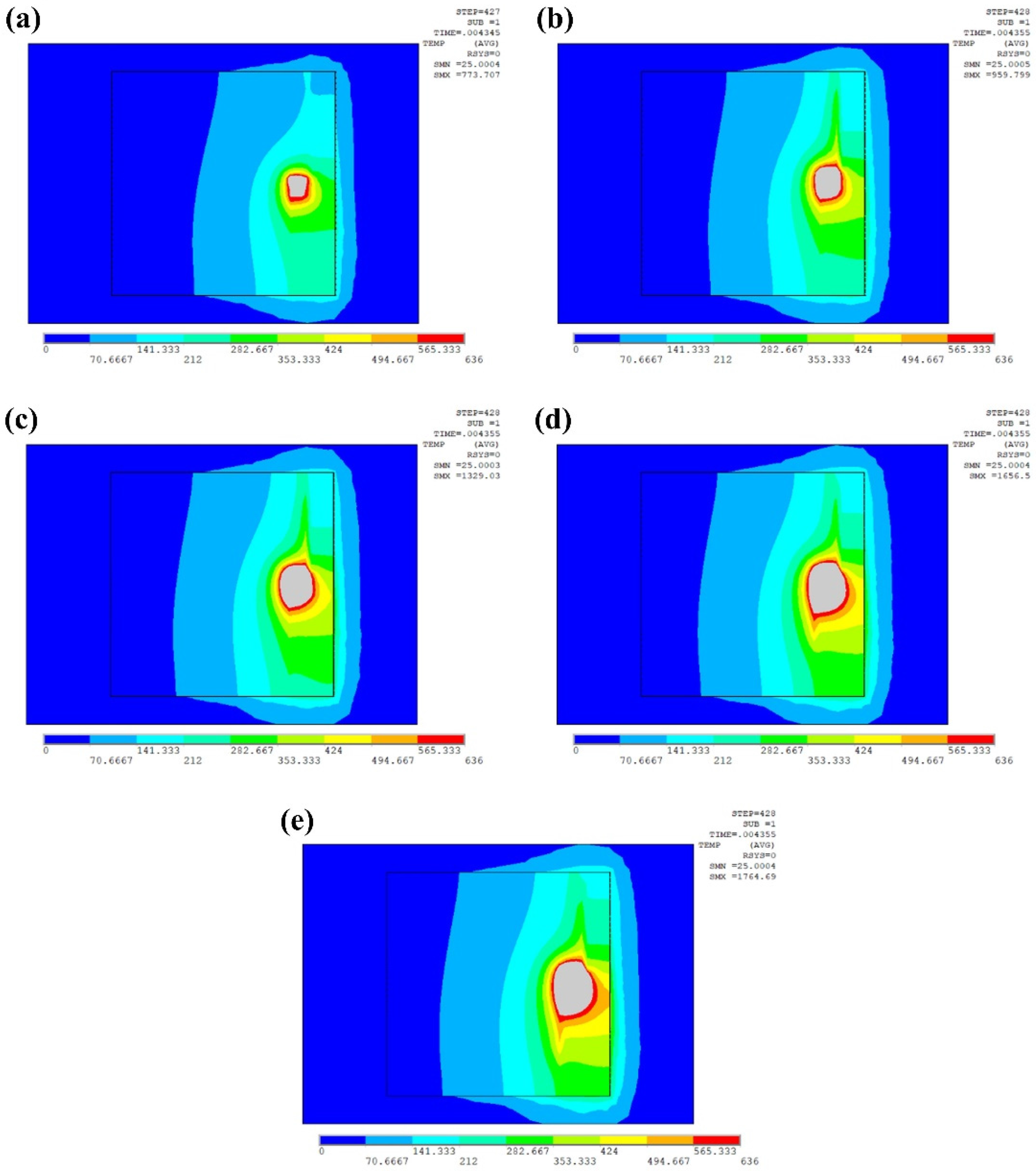 Temperature contours of Al6061 alloy under different laser powers: (a) 200 W, (b) 250 W, (c) 300 W, (d) 350 W, and (e) 400 W.