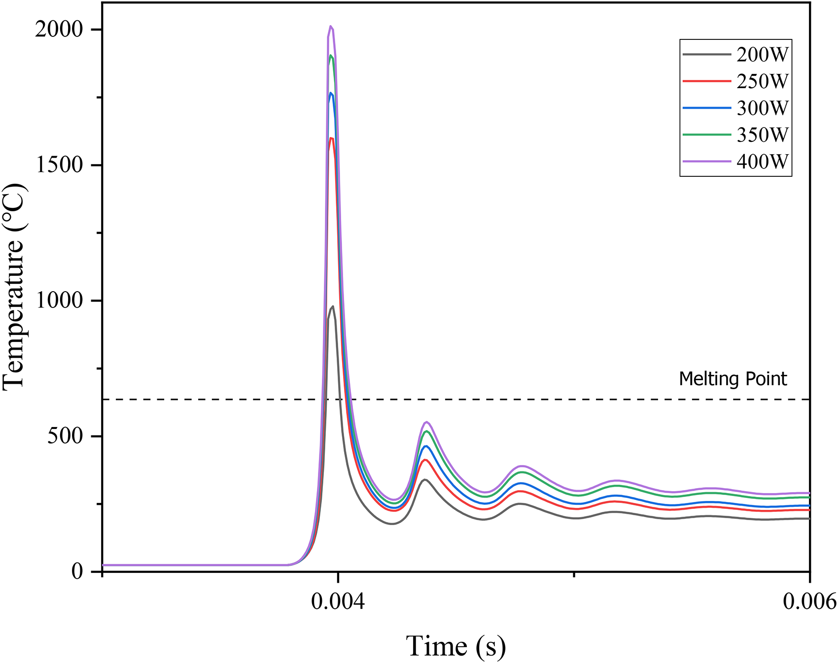 To further explore the influence of laser power on the temperature change at the monitoring point over time, the temperature curve at midpoint of the first scanning path of five groups of laser power with time was analyzed, as shown in Figure 3. It is clear from the simulated curve that the increase of laser power leads to the overall temperature rise at this point. When the laser power is 200 W, the transient peak temperature of the molten pool is 979.18°C when the laser heat source directly acts on this point. When the laser power is 250 W, the temperature increases to 1599.94°C. When the laser power increases to 300 W, 350 W, and 400 W, the transient peak temperature of the molten pool increase to 1766.53°C, 1905.37°C, and 2012.73°C, respectively. The reason for this phenomenon may be that with the increase of laser power, other conditions remain the same, and the energy that laser transfers to the powder material is also more. It can be found that the same laser power variation range leads to different degrees of molten pool temperature variation, which may be related to the laser energy loss caused by the reflectivity of materials and thermal properties of alloy materials such as thermal conductivity.