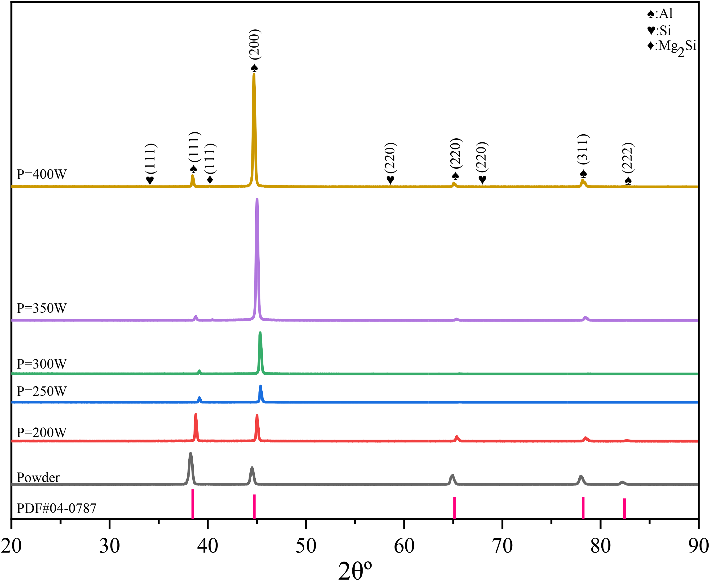 To analyze the effect of laser power on the phase composition, the XRD pattern of Al6061 alloy powder and samples were tested, as shown in Figure 4. It can be seen from that Al alloy have obvious diffraction peaks of {111}, {200}, {220}, {311}, and {222} crystal planes, which are all Al phases after calibration. Weak diffraction peaks of {111} and {220} crystal planes were also observed, which was identified as the Si phase. The diffraction peaks were weak due to the precipitation of nano-sized Si particles in the microstructure. In addition, the diffraction peak of the {111} crystal plane was also observed, which was labeled as the Mg2Si phase. This peak indicated the formation of new substances, but due to the relatively small amount of precipitation of the metal compound, the intensity of the diffraction peak was weak. It also can be seen that the relative strength of the {111} and {200} crystal planes is opposite to the standard powder diffraction pattern of Al, indicating that the Al6061 alloy prepared under different laser powers has a preferred orientation along the {200} crystal plane, which may be related to the addition of trace elements in Al6061 alloy.