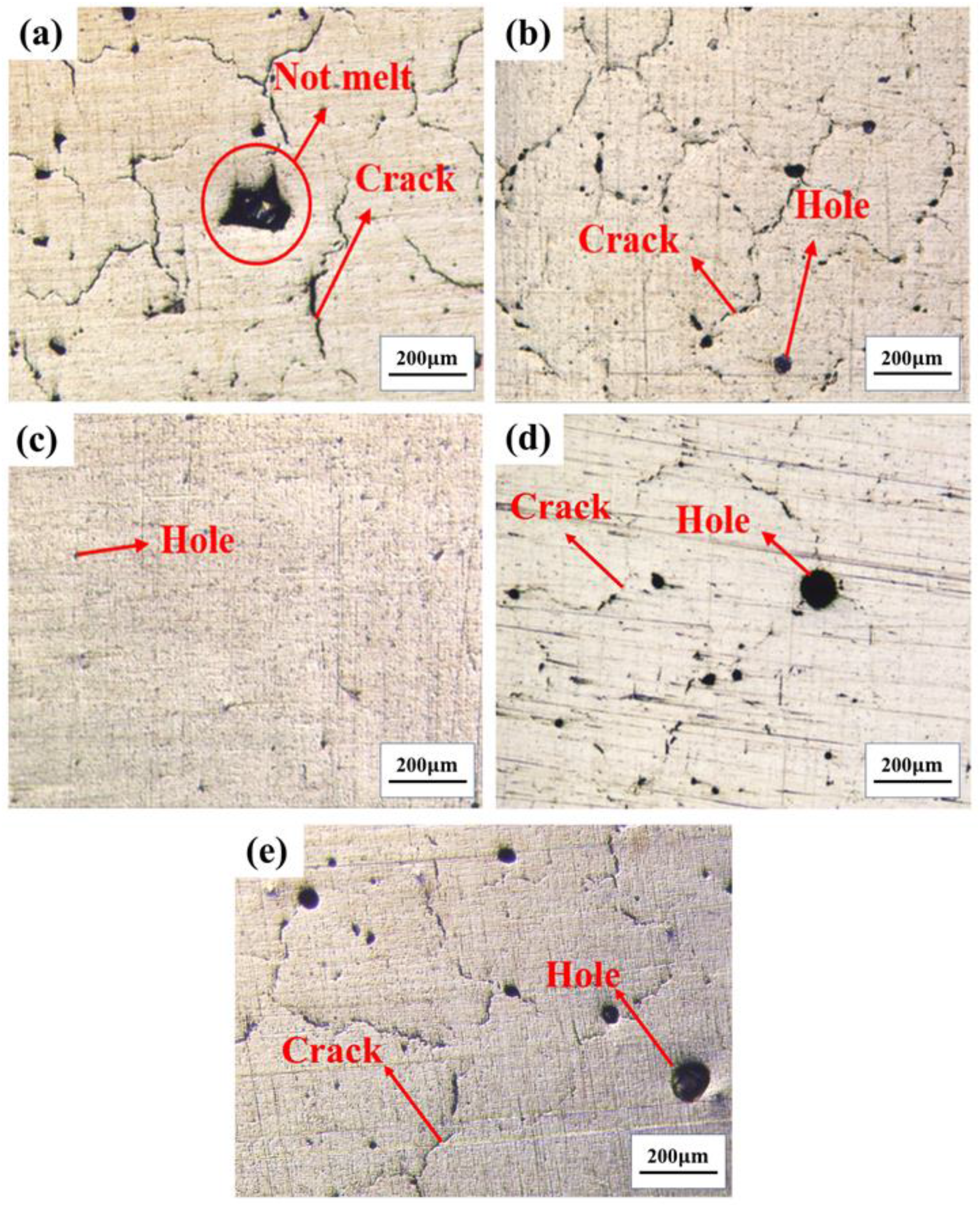 The optical topography with 50x magnification of polished Al6061 alloy manufactured under different laser powers was shown in Figure 5. It can be seen that the surface defects are mainly microcracks and holes. Due to the different initiation reasons of holes and cracks, the growth trends of the two types of defects with the change of laser power are analyzed in two parts.