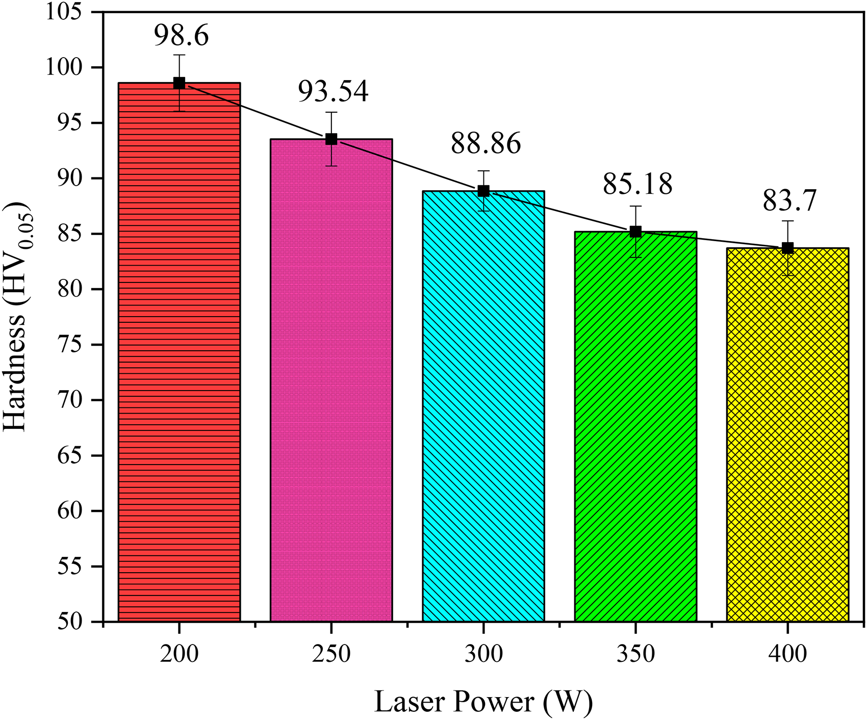 Figure 6 showed the microhardness of Al6061 alloy under different laser powers. It is clear, with the increase of laser power in the range of 200 W to 300 W, the average microhardness of samples decreased. Generally, metal powders are quickly melted into liquid after being scanned by a high-energy laser, which facilitates the distribution of alloying elements. However, if the laser power increases, the liquid phase residence time of molten pool becomes longer. On the one hand, the crystal nucleus will grow in the liquid phase of molten pool after formation, which leads to a coarser grain. On the other hand, alloying elements will continue to segregate, resulting in Si particles in the metal matrix that cannot be uniformly distributed in the matrix, resulting in a coarse structure with uneven grains, 29 which eventually leads to a decrease in the average microhardness of the samples. This explains the decreasing trend of microhardness by increasing the laser power in the figure. However, the increase of laser power will lead to a faster cooling rate, and rapid cooling can slow down the grain growth trend and hinder the segregation of alloying elements to a certain extent. 30 That is to say, when the laser power increases to a critical point, the decreasing trend of microhardness will be alleviated considering the influence of cooling rate. This explains that when the laser power reaches 300 W and continues to increase in the figure, the slope of the curve gradually decreases and the curve gradually becomes flat. In conclusion, with the increase of laser power, the microhardness of the samples gradually decreases, and the decreasing trend gradually becomes slow.