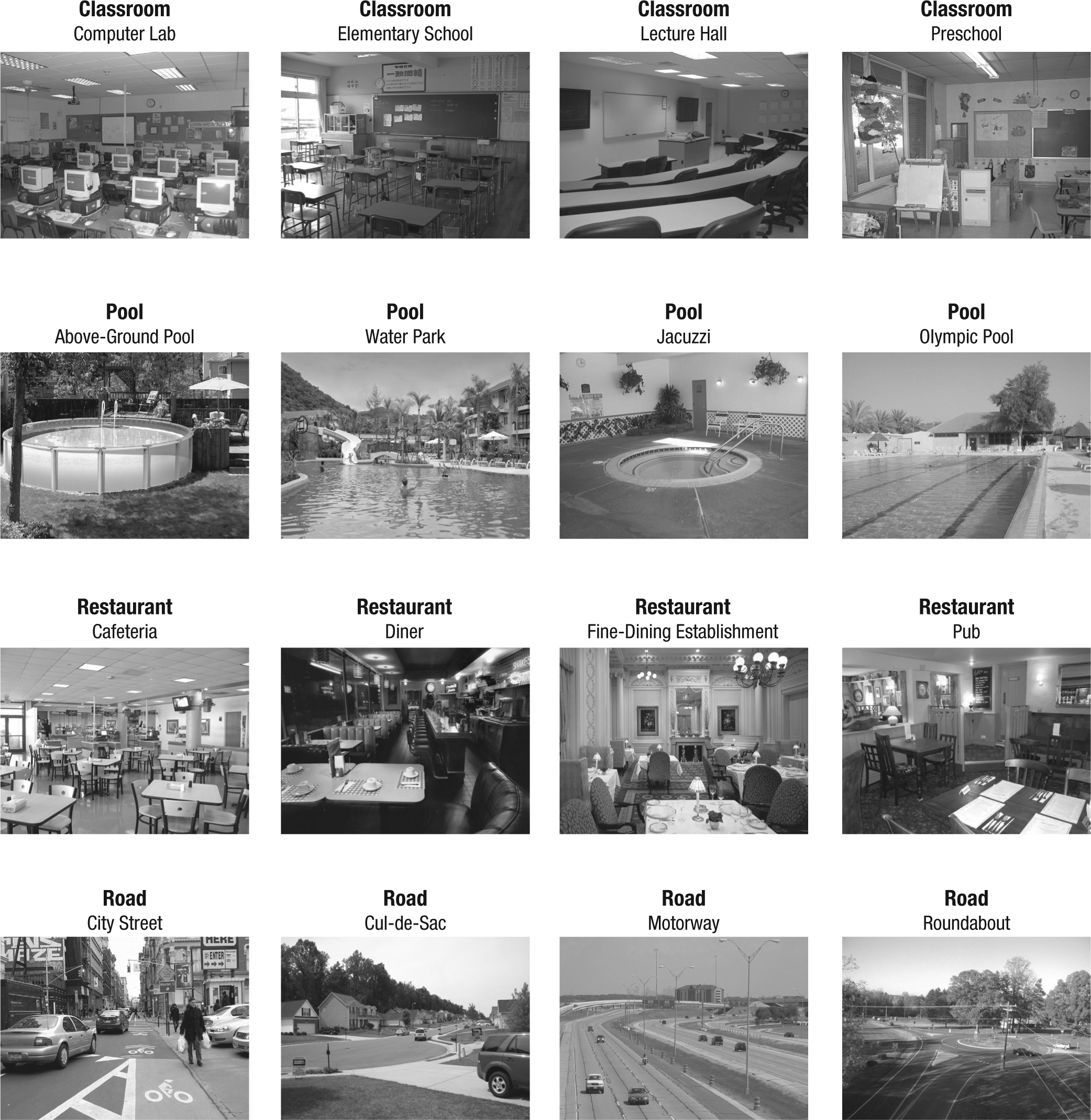 We selected 32 scenes from Google Images and converted them to gray scale (800 × 600 pixel resolution). Each scene belonged to one of four basic-level categories (restaurant, classroom, road, and pool), and within each basic category, each scene belonged to one of four subordinate categories (restaurant: diner, cafeteria, fine-dining establishment, pub; classroom: computer lab, lecture hall, preschool, elementary school; road: motorway, cul-de-sac, city street, roundabout; pool: Olympic pool, above-ground pool, Jacuzzi, water park). Thus, each scene could be categorized at two levels of specificity (Fig. 1).