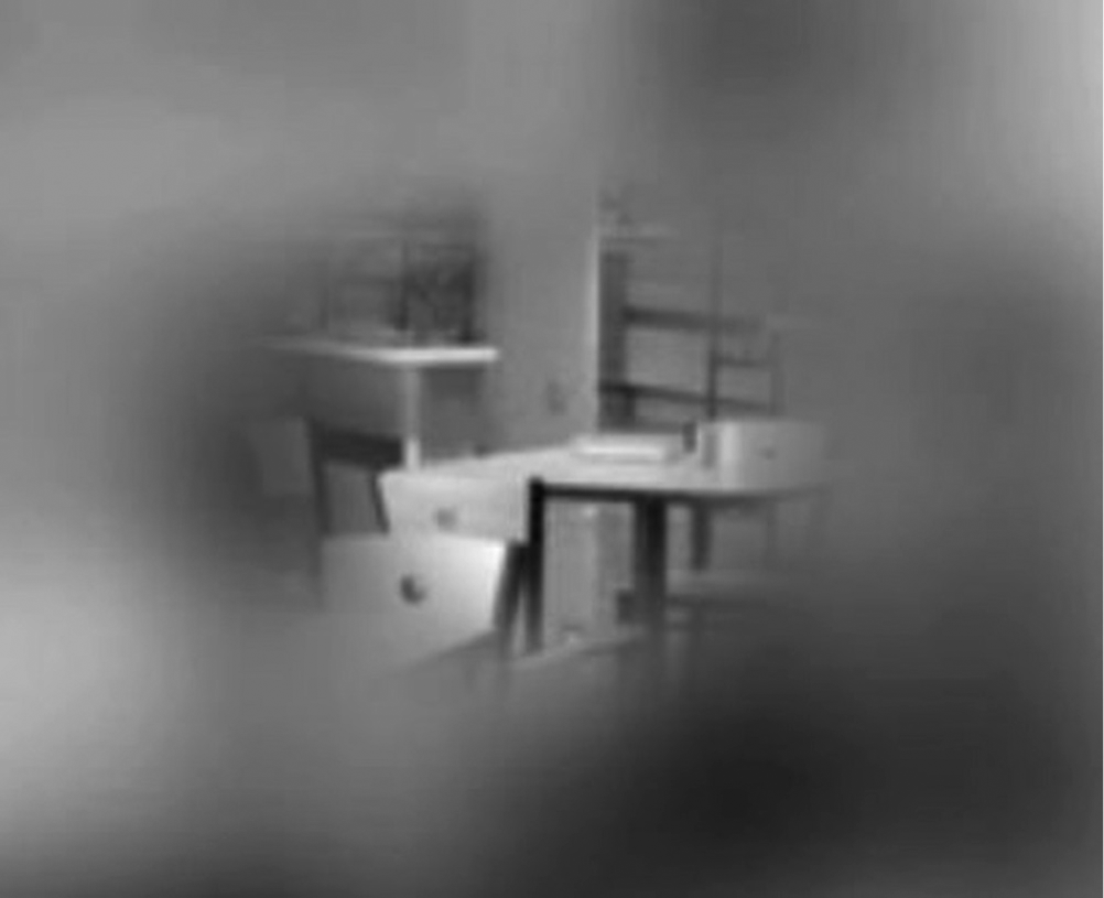 Example of what a participant might have seen during the gaze-contingent experiment. Each scene was presented at low spatial frequencies. However, an area 2.5° in diameter appeared in full resolution wherever participants moved their eyes. A Gaussian low-pass filter was applied around the border of the window to avoid perceptual problems resulting from sharp boundaries.
