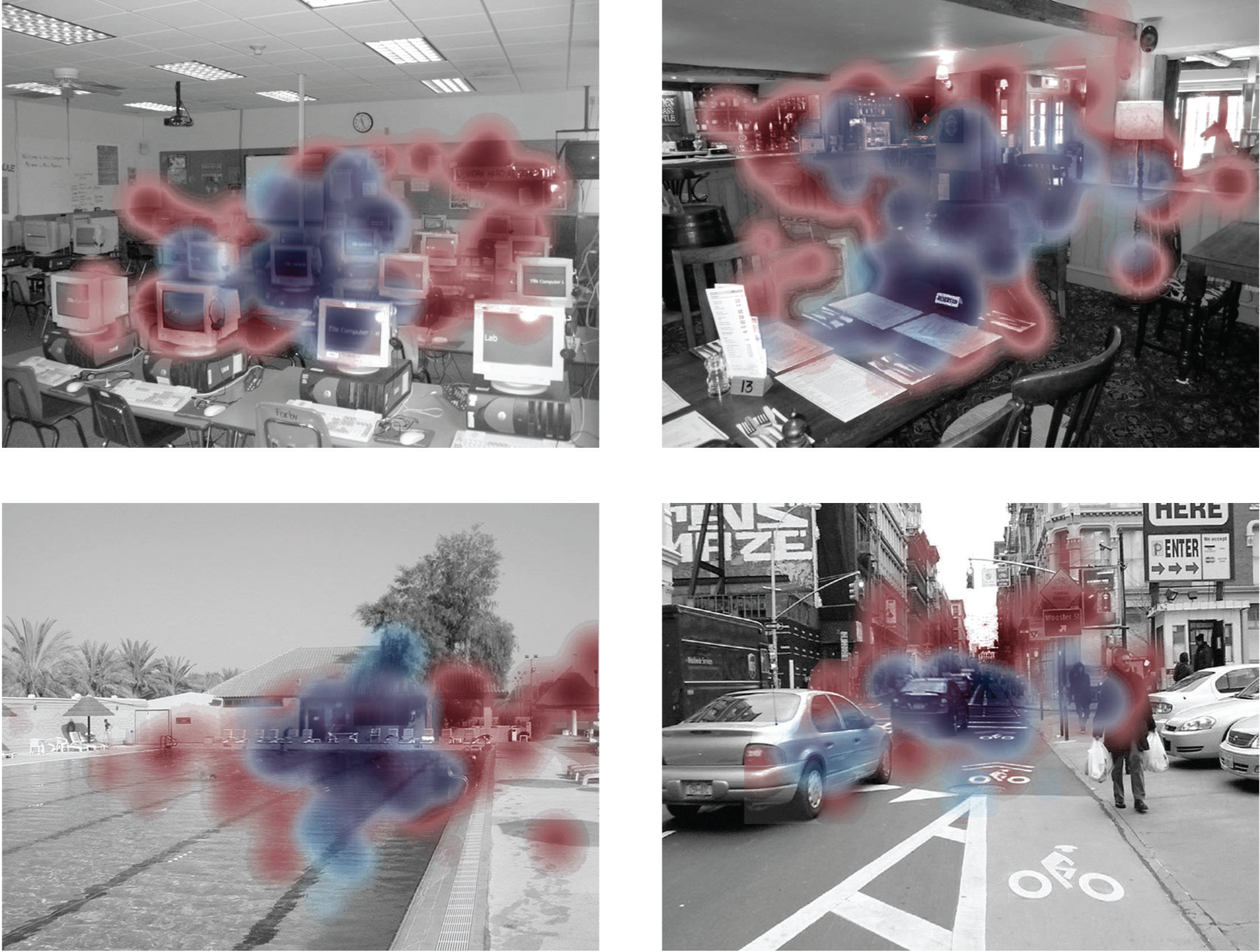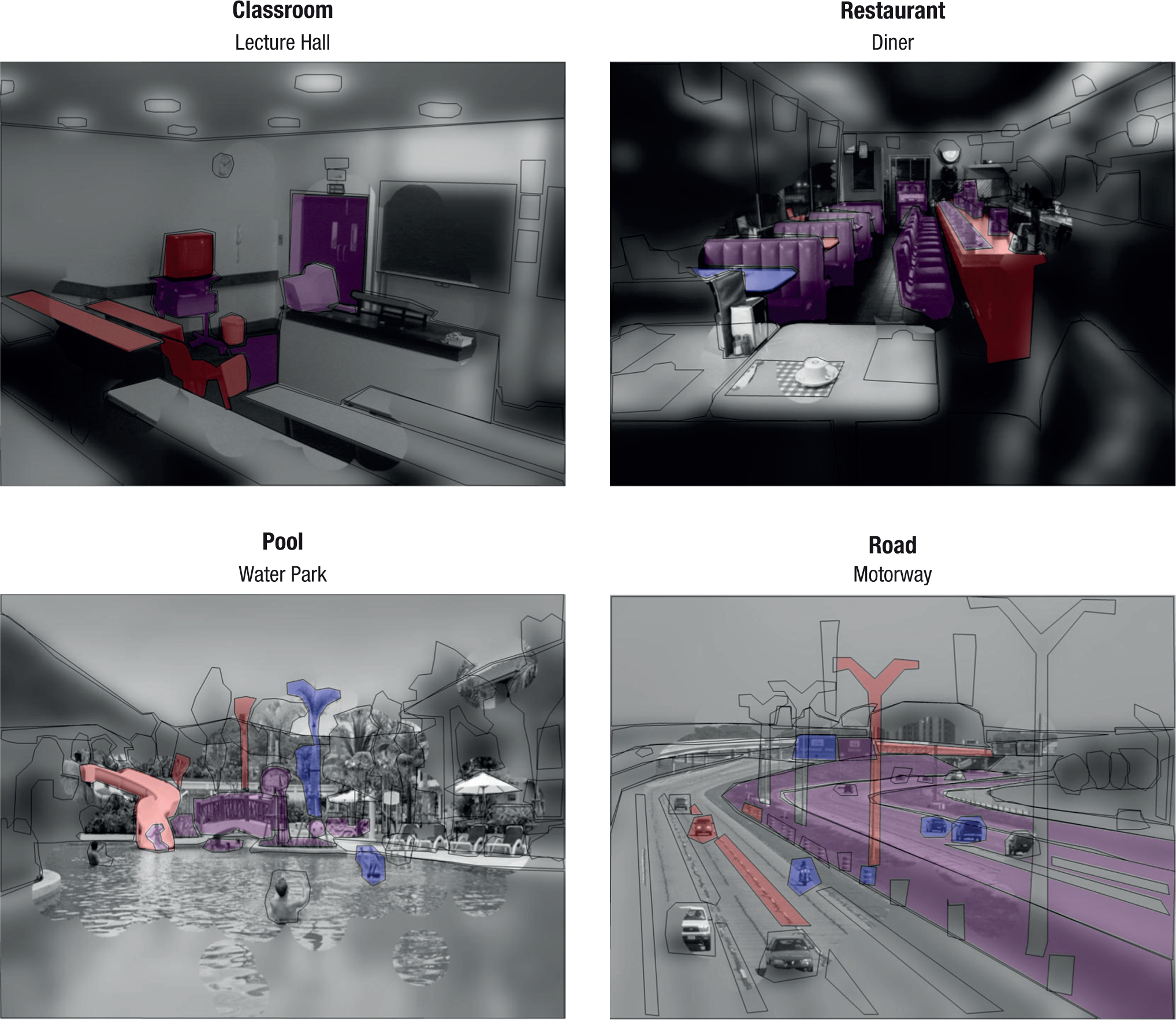 Illustration showing fixated scene regions in the basic and subordinate conditions. Each panel shows a low-pass-filtered version of a scene from one of the four categories in which every fixated area in both categorization groups is mapped in full resolution (objects are outlined here for clarity). Blue regions indicate objects significantly fixated in the basic condition, red regions indicate objects significantly fixated in the subordinate condition, and purple areas indicate objects significantly fixated in both conditions.