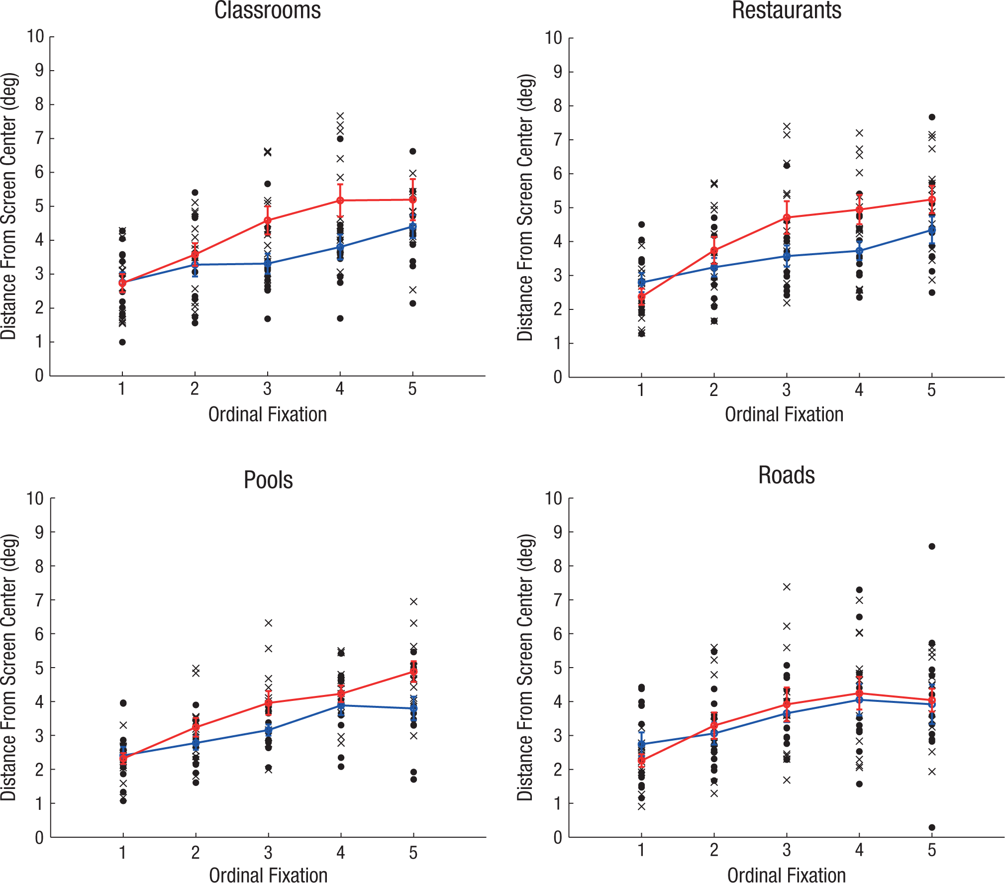 Distance of fixations from the center of the screen as a function of ordinal fixation, separately for the four basic categories of stimuli. Black circles and crosses represent individual means for each participant in the basic and subordinate conditions, respectively. Means across the basic and subordinate conditions are indicated, respectively, by blue and red circles (lines connecting the condition means are shown for clarity). Errors bars represent ±1