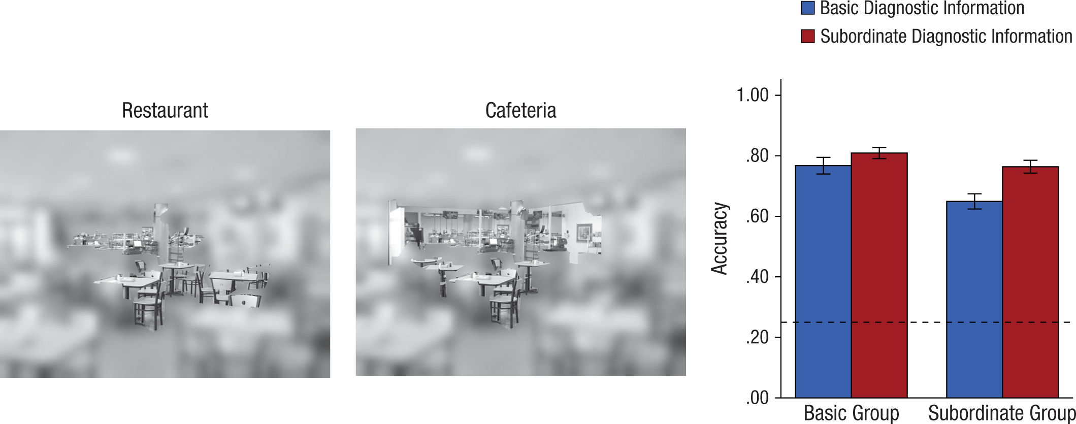Paradigm and results from the validation experiment. Participants were asked to categorize individual scenes, but unlike in the gaze-contingent experiment, each scene contained objects identified as diagnostic at either the basic level (example shown on left) or subordinate level (example shown in middle). These objects were revealed at full resolution while the rest of the scene was low-pass filtered. The graph shows mean accuracy as a function of condition and the type of diagnostic information presented. The dashed line indicates chance performance. Error bars represent ±1