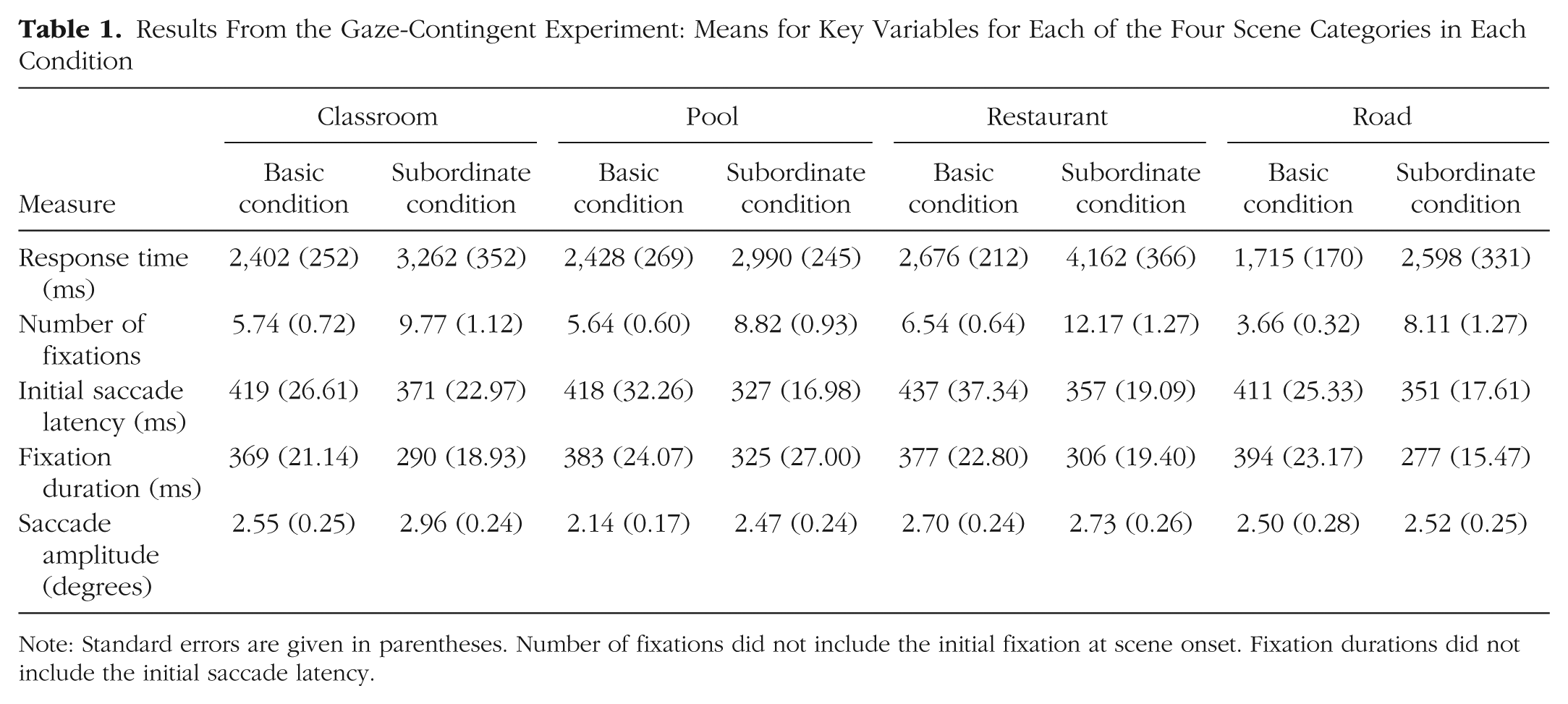 Note: Standard errors are given in parentheses. Number of fixations did not include the initial fixation at scene onset. Fixation durations did not include the initial saccade latency.