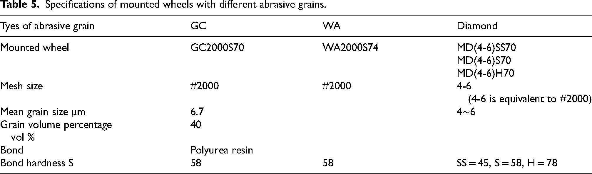 Specifications of mounted wheels with different abrasive grains.