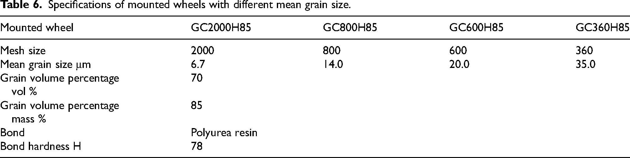 Specifications of mounted wheels with different mean grain size.
