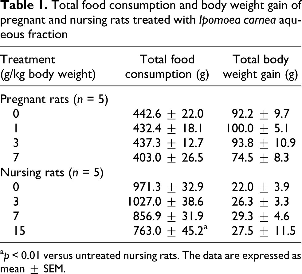 Total food consumption and body weight gain of pregnant and nursing rats treated with Ipomoea carnea aqueous fraction