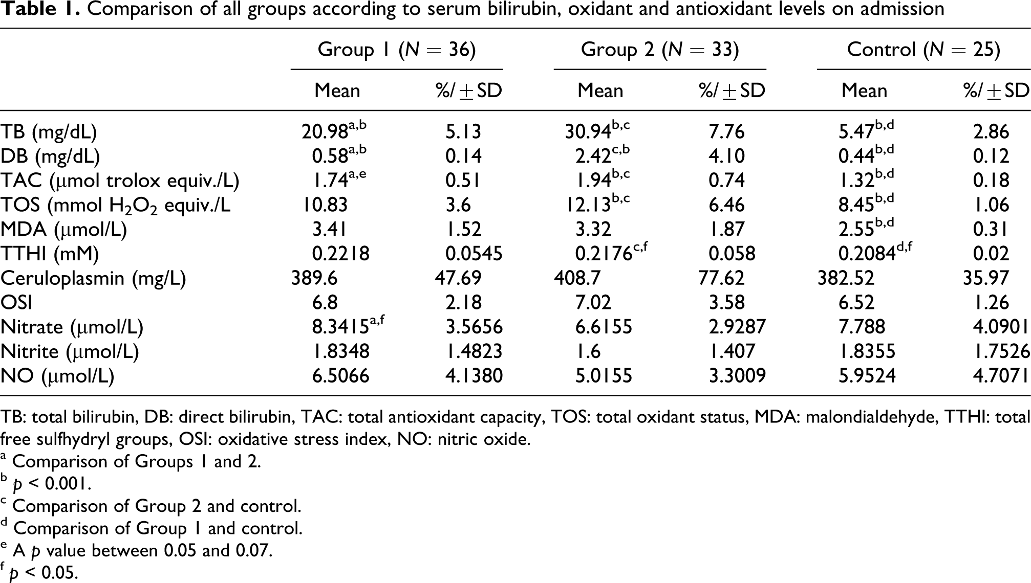 TB: total bilirubin, DB: direct bilirubin, TAC: total antioxidant capacity, TOS: total oxidant status, MDA: malondialdehyde, TTHI: total free sulfhydryl groups, OSI: oxidative stress index, NO: nitric oxide.
