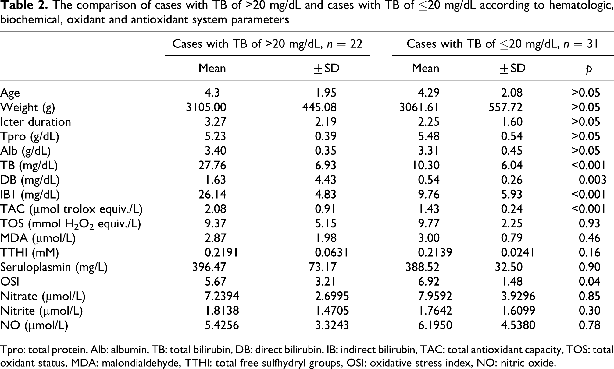 The comparison of cases with TB of >20 mg/dL and cases with TB of ≤20 mg/dL according to hematologic, biochemical, oxidant and antioxidant system parameters