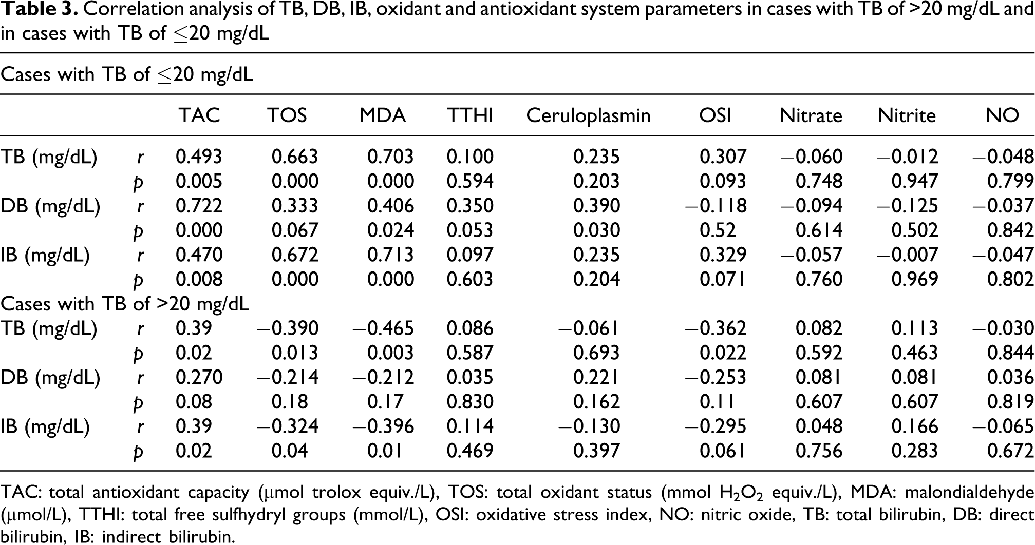 Correlation analysis of TB, DB, IB, oxidant and antioxidant system parameters in cases with TB of >20 mg/dL and in cases with TB of ≤20 mg/dL