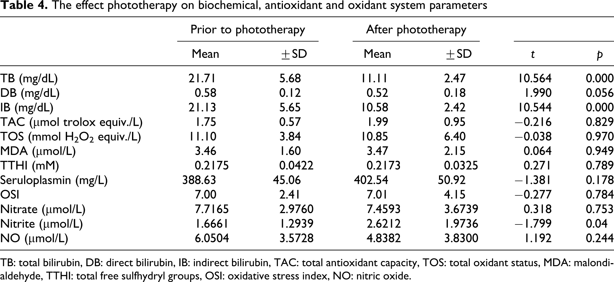 Satar 32 reported that antioxidant enzyme levels decreased as the level of bilirubin increased in full-term newborns with hyperbilirubinemia. After bilirubin values decreased by the effect of phototherapy, an increase was found in these enzyme levels. In contrast, Gathwala and Sharma 33 showed that blue light phototherapy increased the oxidative stress in preterm infants. Additionally, Dahiya et al. 34 showed that MDA levels significantly increased after phototherapy compared to pre-phototherapy levels, whereas GSH, TTHI and vitamin C significantly decreased after phototherapy. In conclusion, they suggested that phototherapy increased oxidative stress and should be used with care. In our study in which the effects of phototherapy on oxidant and antioxidant parameters were assessed, only nitrite was found to be affected and it showed an increase compared to pre-treatment values. This can be interpreted as phototherapy increasing the oxidative stress which was consistent with the literature. However, we could not find any significant change in MDA and TTHI levels. Similarly, Akisü et al.35,36 did not find any significant change in the levels of MDA and antioxidant parameters after phototherapy in their study.