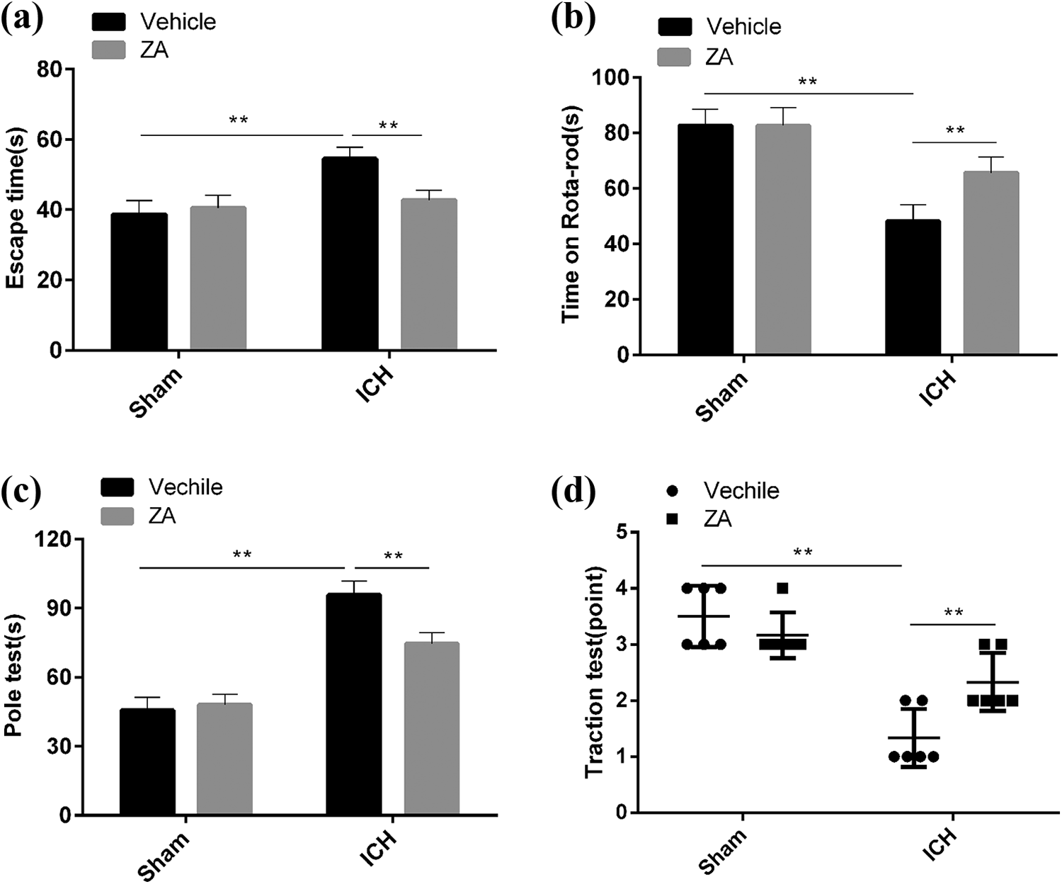 In this study, the neurobehavioral experiments demonstrated the neurological deficits caused by ICH and the therapeutic effects of ZYAND. The results of the Morris water maze test, rotating bar test, traction test, and polar test indicated that the administration of ZYAND primarily improves motor function after ICH, providing suggestions for addressing relevant clinical issues in human ICH.