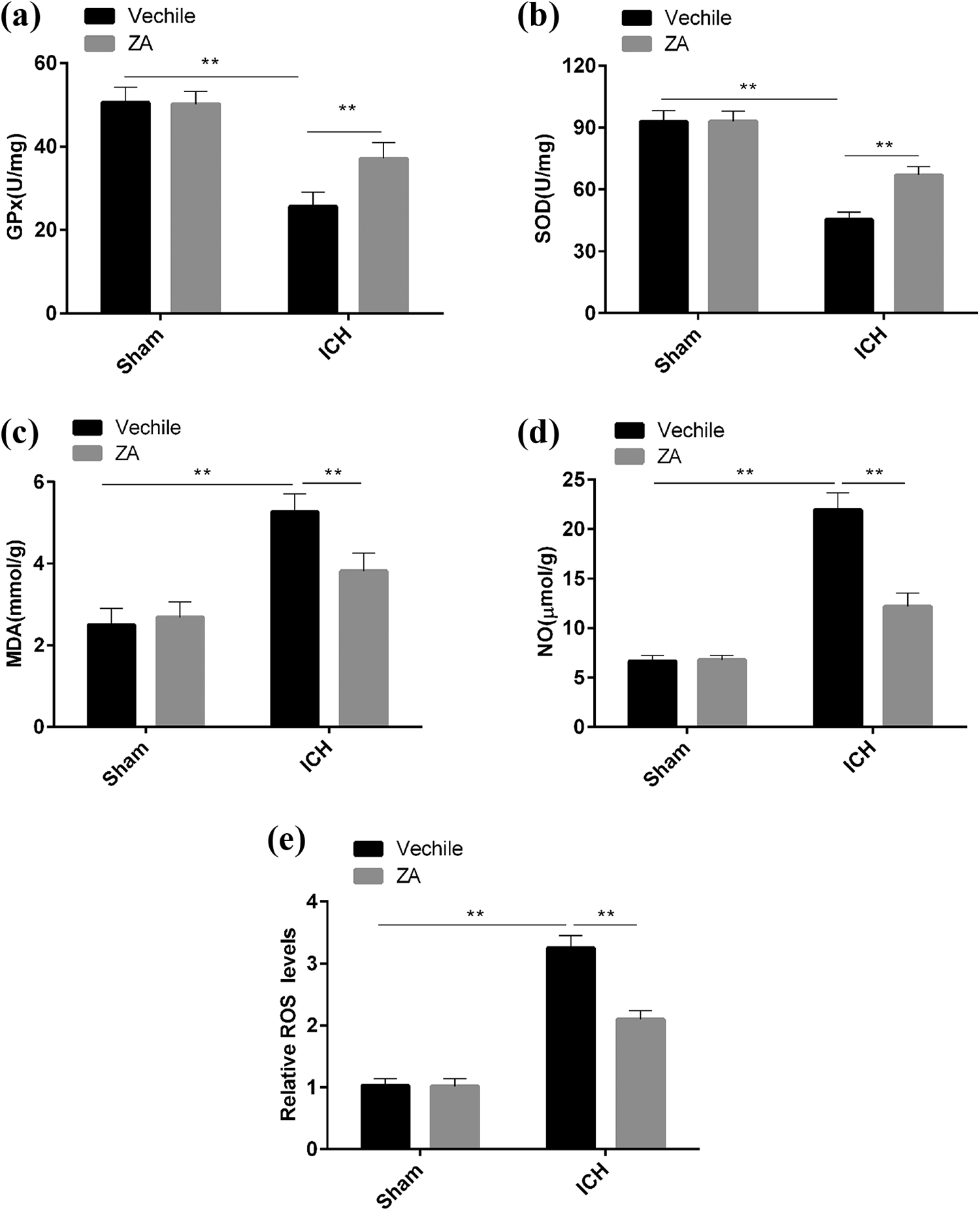 Zhuyu Annao decoction (ZA) inhibits ICH-induced oxidative stress. (a)–(d) Concentrations of oxidative stress indicators glutathione peroxidase (GPx) (a), superoxide dismutase (SOD) (b), malondialdehyde (MDA) (c) and nitric oxide (NO) (d) in brain tissues were determined by commercial kits as described in the Methods section. (e) Intracellular ROS production in brain slices was assessed by H2DCF-DA staining, and the relative ROS level of each group was determined by an enzymograph. All data are expressed as standard deviation ± SD. **P < 0.01 represents significant difference, n = 6 for per group.