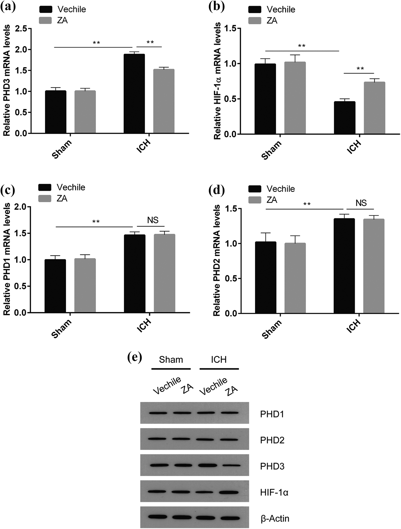 Zhuyu Annao decoction (ZA) activates the PHD3/HIF-1α signaling pathway. (a)–(d) The effects of Zhuyu Annao decoction on PHD1, PHD2, PHD3 and HIF-1α mRNA expression in ICH-induced mouse brain tissues were detected by real-time quantitative PCR. (e) Western blot detects the effects of Zhuyu Annao decoction on PHD1, PHD2, PHD3 and HIF-1α protein expression in ICH-induced brain tissues. All data are expressed as standard deviation ± SD. **P < 0.01 represents significant difference, n = 6 for per group.