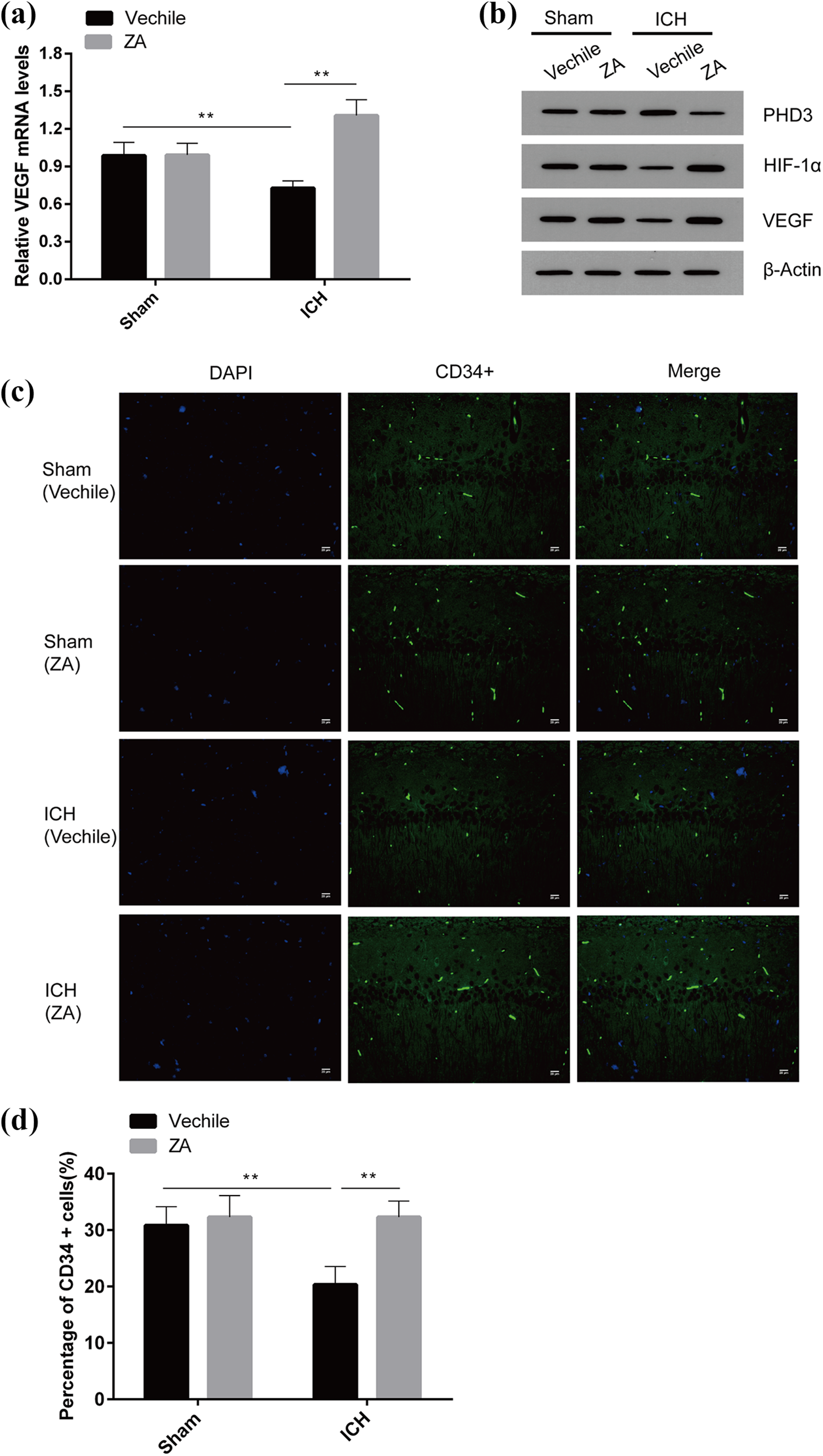 Zhuyu Annao decoction (ZA) promotes angiogenesis after ICH. (a) The effect of Zhuyu Annao decoction on the expression of the angiogenic factor VEGF by real-time quantitative PCR. (b) Western blot was performed to detect the effect of Zhuyu Annao decoction on the expression of VEGF in ICH-induced mouse brain tissues. (c) Immunofluorescence detection of the number of CD34+ cells in mouse brain tissue and assessment of angiogenesis in mice. (d) Percentage of CD34+ cells in mice treated with Zhuyu Annao decoction or control solvent. All data are expressed as standard deviation ± SD. **P < 0.01 represents significant difference, n = 6 for per group.