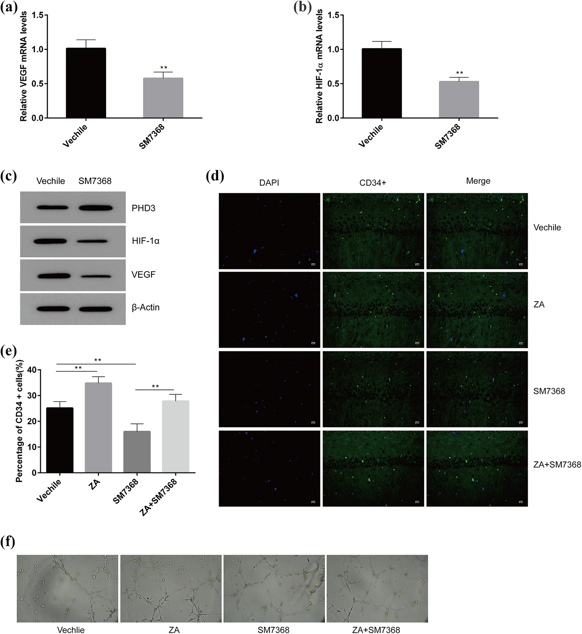(a) and (b) Real-time quantitative PCR detection of the effect of NF-kB inhibitorSM7368on VEGF and HIF-1α expression. (c) Western blot detection of the effect of SM7368 on PHD3, VEGF and HIF-1α expression. (d) Immunofluorescence detection of effects of Zhuyu Annao decoction and SM7368 on angiogenesis in mouse brain tissue (as assessed by CD34+ cell number). (e) The angiogenic capacity of HUVEC cells was detected by angiogenesis assay. All data are expressed as standard deviation ± SD. **P < 0.01 represents significant difference, n = 6 for per group.