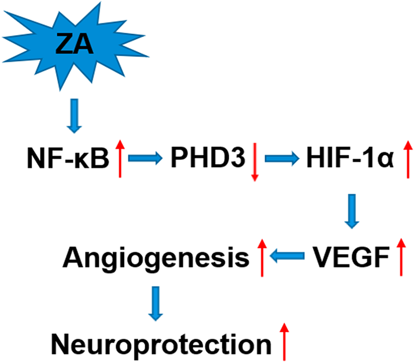 In this study, we demonstrated that ZYAND reduces neurological deficits and promotes the formation of microvessels in damaged brain tissues in a mouse model of ICH. Possible mechanisms include an increase in HIF-1α expression after treatment, which is achieved via the activation of the NF-κB signaling pathway. We identified a new signaling axis, namely, ZYAND/NF-κB/NF-κB/PHD3/HIF-1α, which contribute to regulate angiogenesis and tissue repair in damaged brain tissues after ICH (Figure 7). In addition, we demonstrated that ZYAND inhibits the oxidative damage caused by ICH, thus protecting the damaged brain tissues.