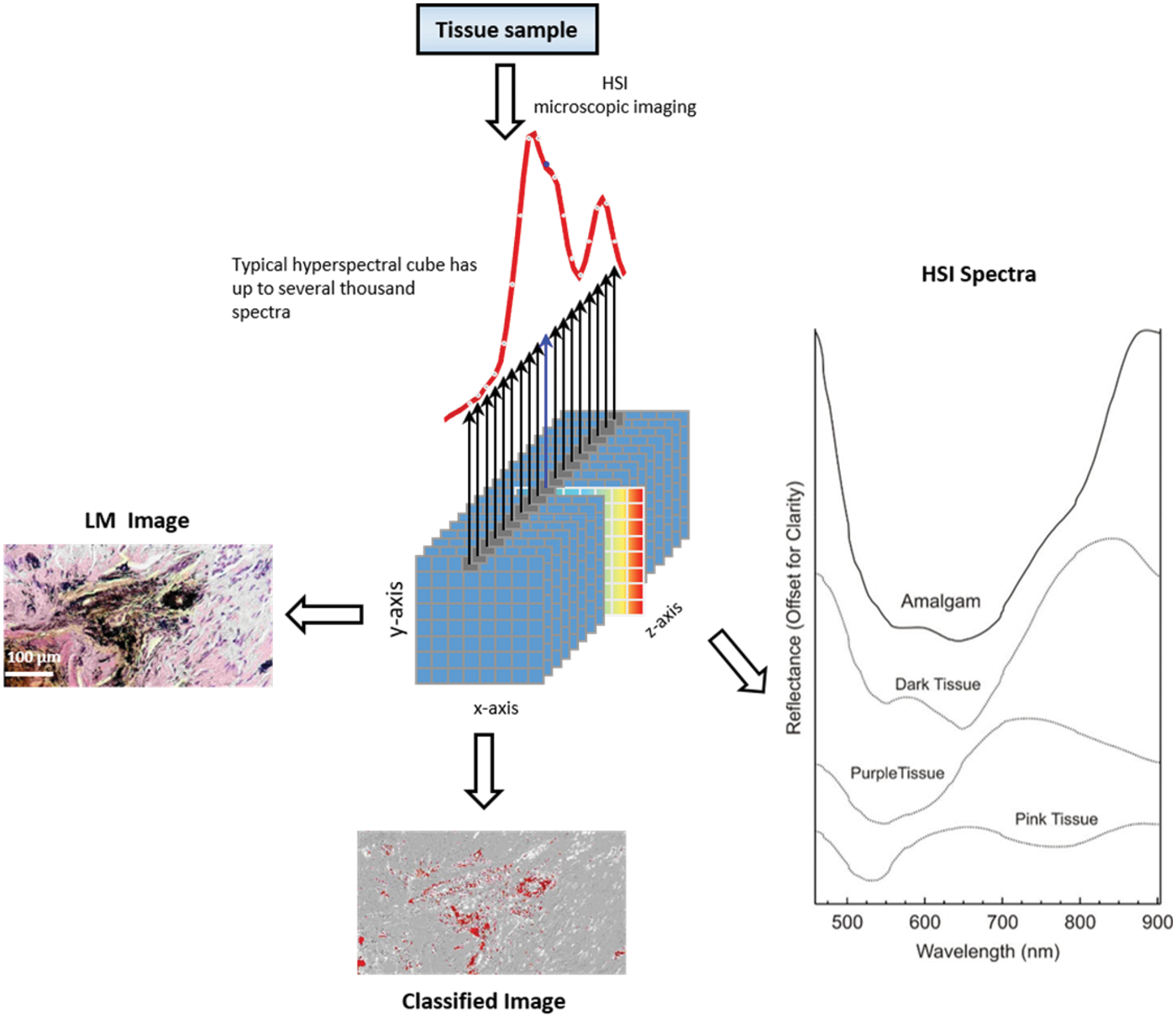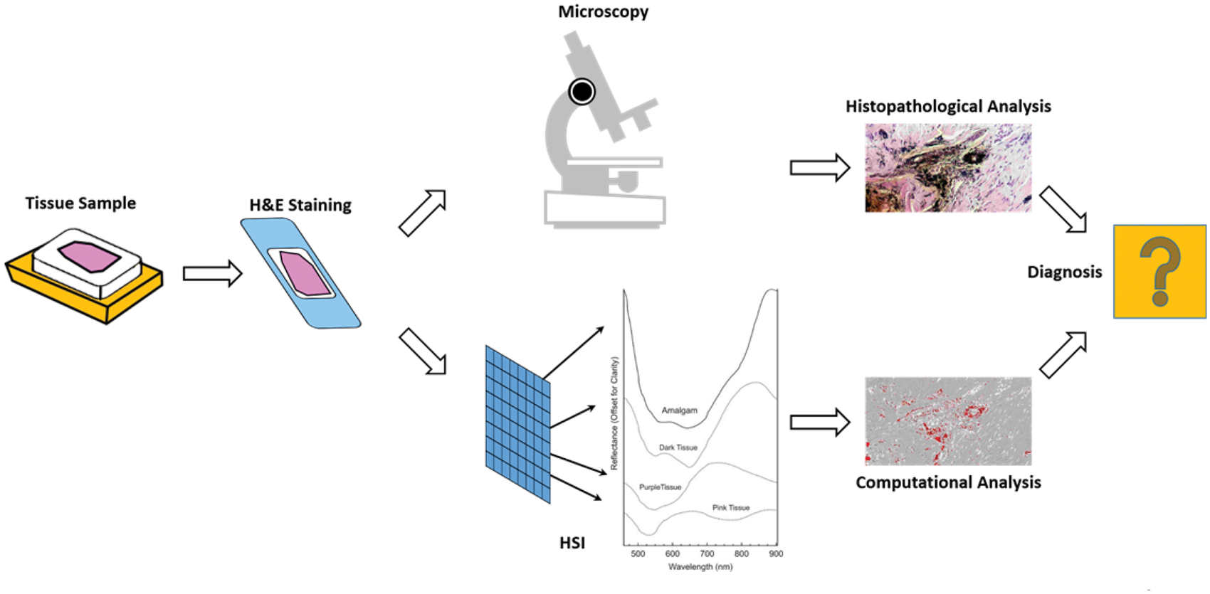 Workflow proposal for HSI as a diagnostic tool to differentiate amalgam tattoos from melanocytic lesions. 14 The current workflow for tissue diagnosis involves sample preparation, assessment of tissue morphology by a pathologist, measurements of several tissue sections, analysis of the obtained data, and direct comparisons of the HSI results with the pathological examination.
