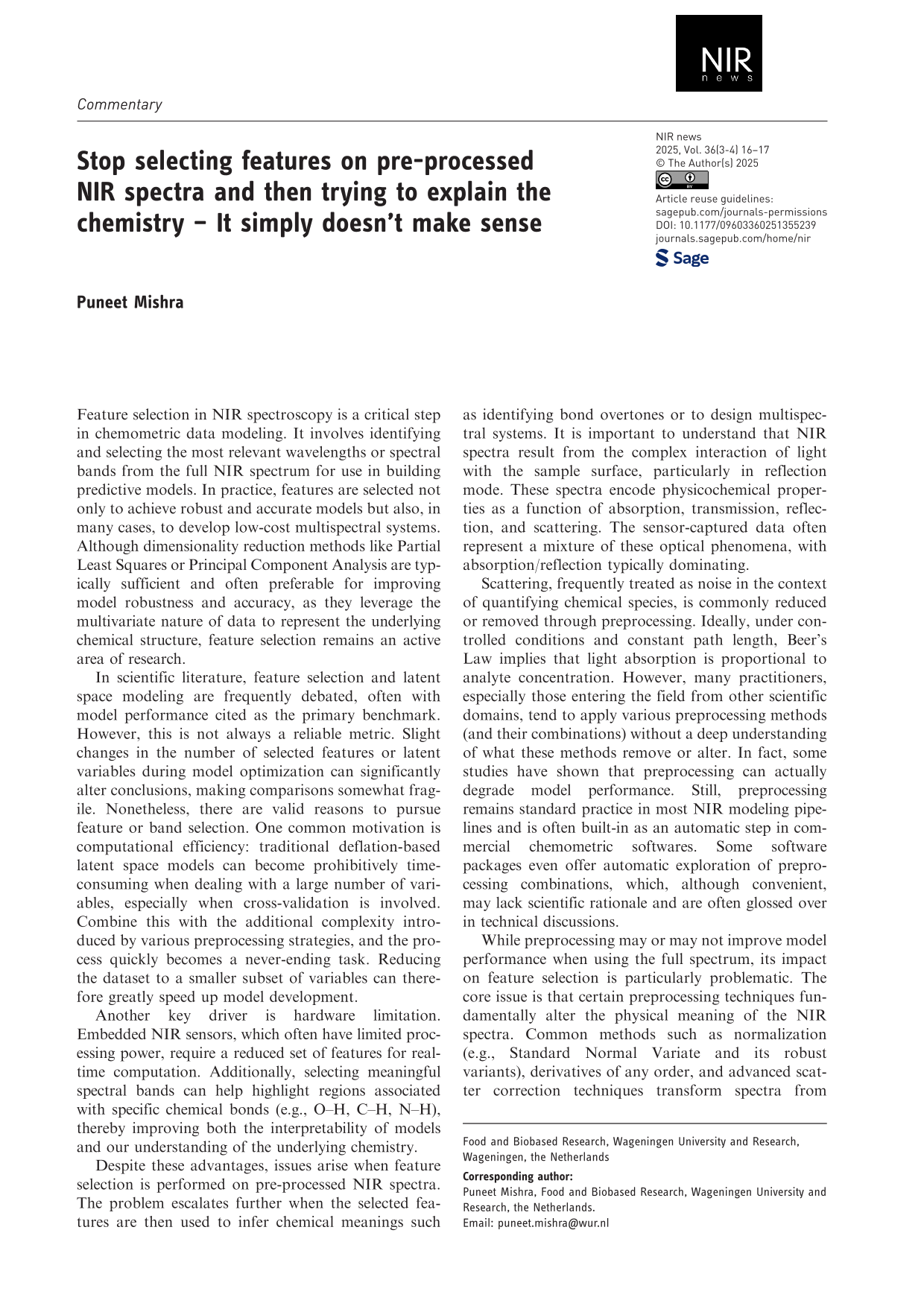 Now, imagine designing a multispectral system based on features selected from standard normal variate pre-processed spectra. Would it work in the real world? Most likely not. This practice fundamentally misunderstands the interaction between preprocessing and spectral feature selection. If you know someone applying feature selection in this way, please share this commentary with them. Together, we can raise awareness and ensure that the science of NIR spectroscopy remains grounded, interpretable, and practically useful.