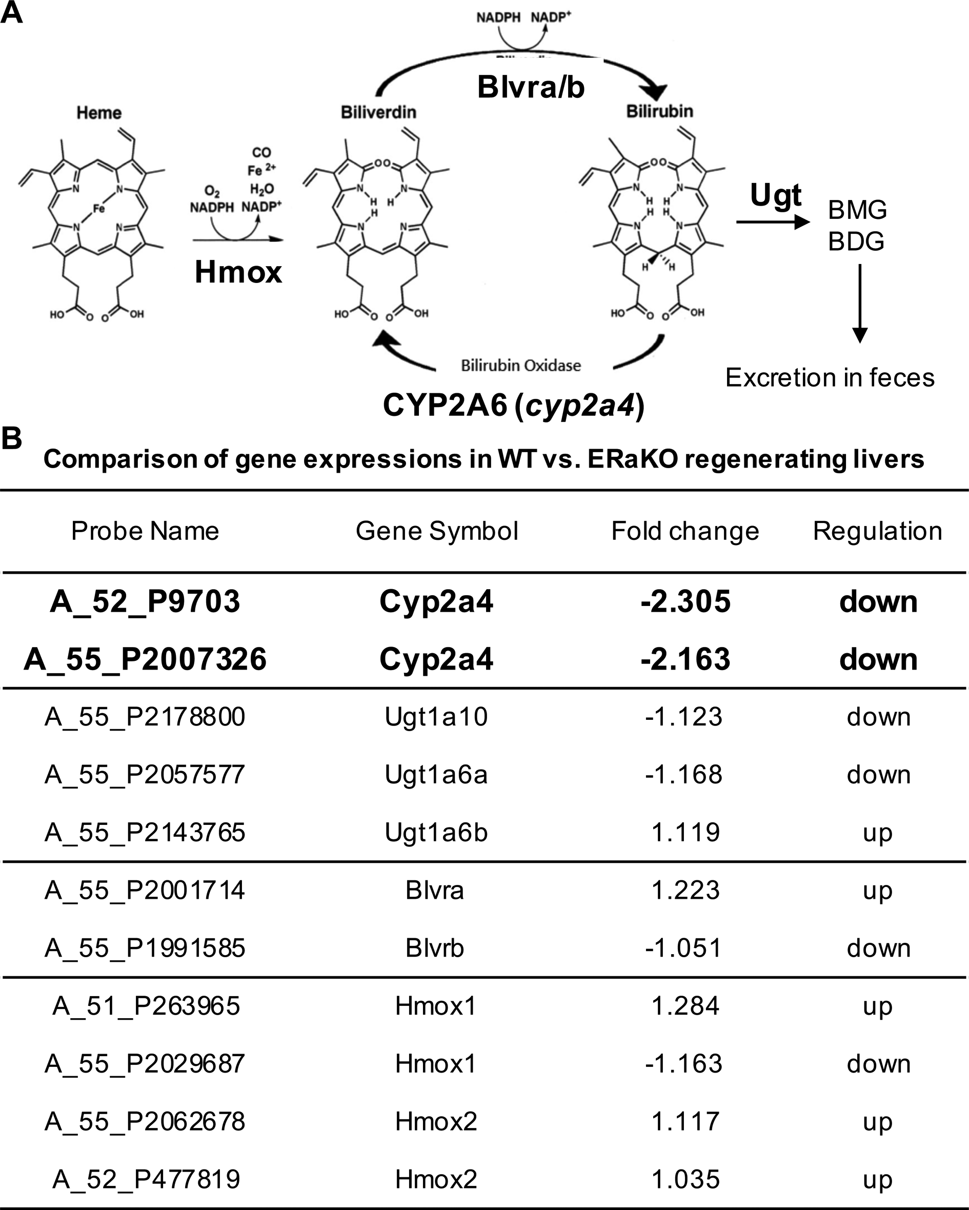 The metabolism of heme into bilirubin and biliverdin is illustrated in Fig. 2A. The heme moiety is oxidized by heme oxygenase (Hmox) to biliverdin, which is then reduced by biliverdin reductase (Blvr-a or Blvr-b) to bilirubin. The reduction is reversed by CYP1A6 (or cyp2a4 in rodents). Finally, the bilirubin can be converted by UGT to bilirubin monoglucuronide (BMG) or bilirubin diglucuronide (BDG) and finally excreted in the feces.