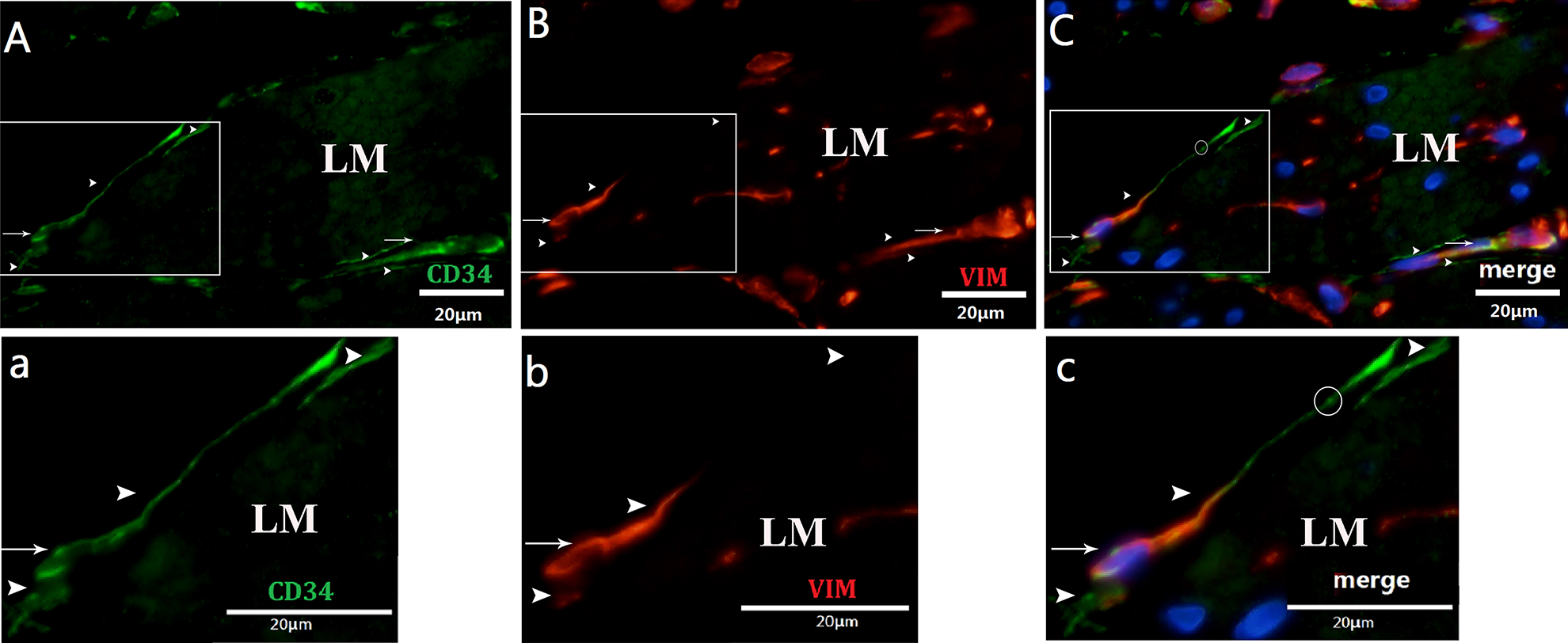 CD34+ (green in A)/Vimentin+ (red in B) labelled TC-LMs, around the smooth muscle bundles. Square marked areas in (A, B, C) are enlarged in (a, b, c), respectively. (a–c) A spindle-shaped TC with two long processes, close to other telopodes. (c) A podom, marked as a bright spot (circle). Nucleus (arrow) and process (arrowhead). Bar = 20 μm in A–C, a–c.