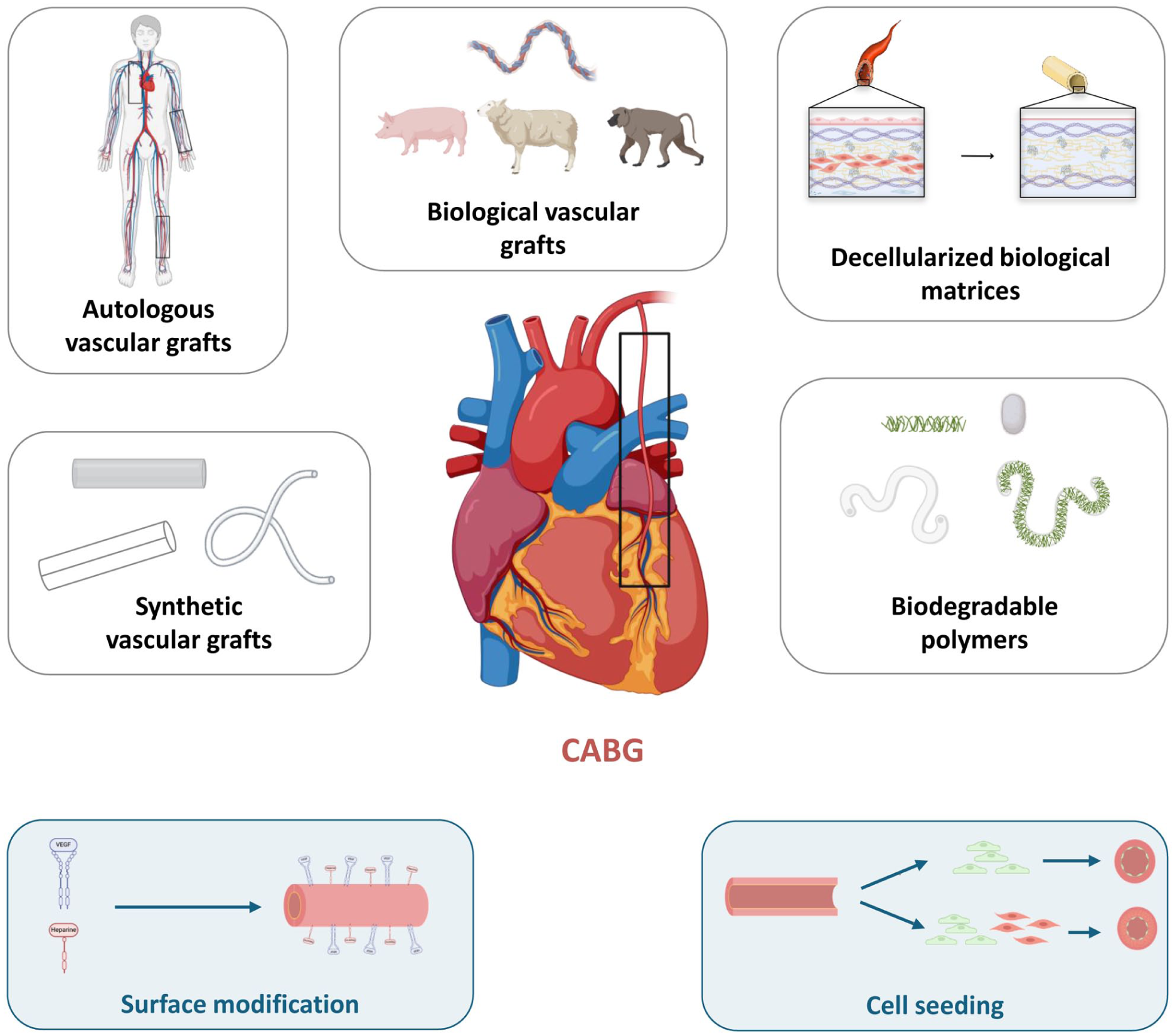 Clinical studies on non-autologous vascular grafts for CABG are limited, mostly old, and largely anecdotal. These early trials provide only preliminary insights into the feasibility and safety of TEVGs in humans, and their use is still restricted due to complications such as stenosis, thrombosis, and limited long-term patency. Within the field of vascular substitutes for CABG, grafts can be broadly divided into three categories: synthetic, biological, and TEVG.