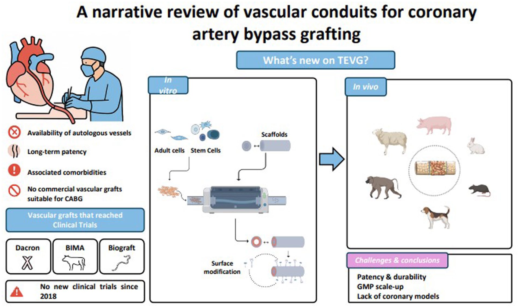 Another major limitation is the lack of consistency across preclinical models. While small animals allow rapid proof-of-concept testing, they do not replicate the hemodynamic or immunological complexity of humans. Large-animal models such as pigs or sheep provide closer similarity but still exhibit species-specific responses such as intimal hyperplasia or hyperthrombogenicity. Moreover, most experimental grafts have been tested in non-coronary positions, making it difficult to extrapolate outcomes directly to CABG.