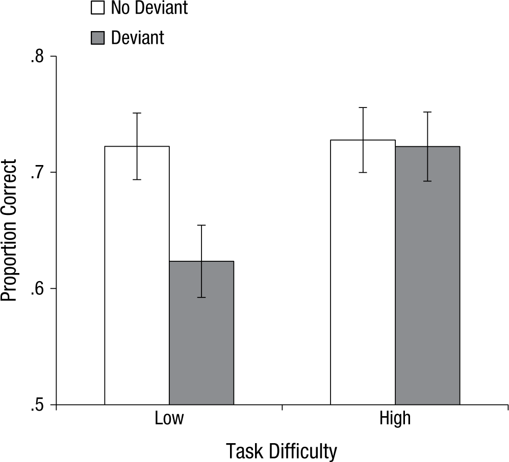 Proportion of correct responses for “no deviant” and “deviant” trials in low-difficulty and high-difficulty task conditions (Hughes, Hurlstone, Marsh, Vachon, & Jones, 2013). Error bars show standard errors of the means.