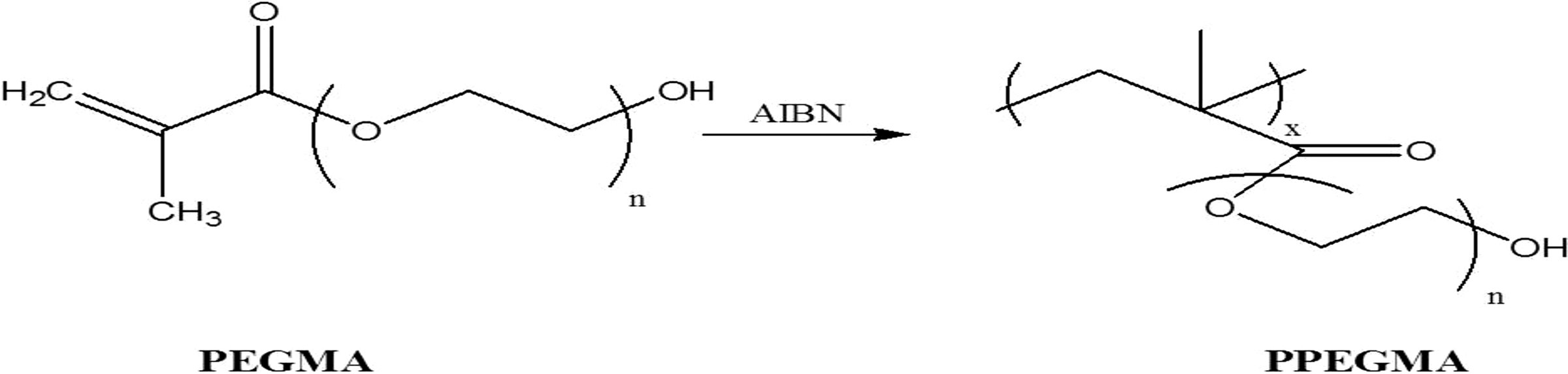 An amount of 4 g of PEGMA was dissolved in 10 ml of DMF and stirred for 10 min; 1% of AIBN initiator was introduced into the reaction flask to initiate the polymerization reaction. The mixture was stirred at 70°C under a nitrogen (N2) environment for 5 h. Then, the PPEGMA was washed with ethanol to remove the unreacted monomer and the remaining AIBN. Figure 1 shows the polymerization of PEGMA to PPEGMA.