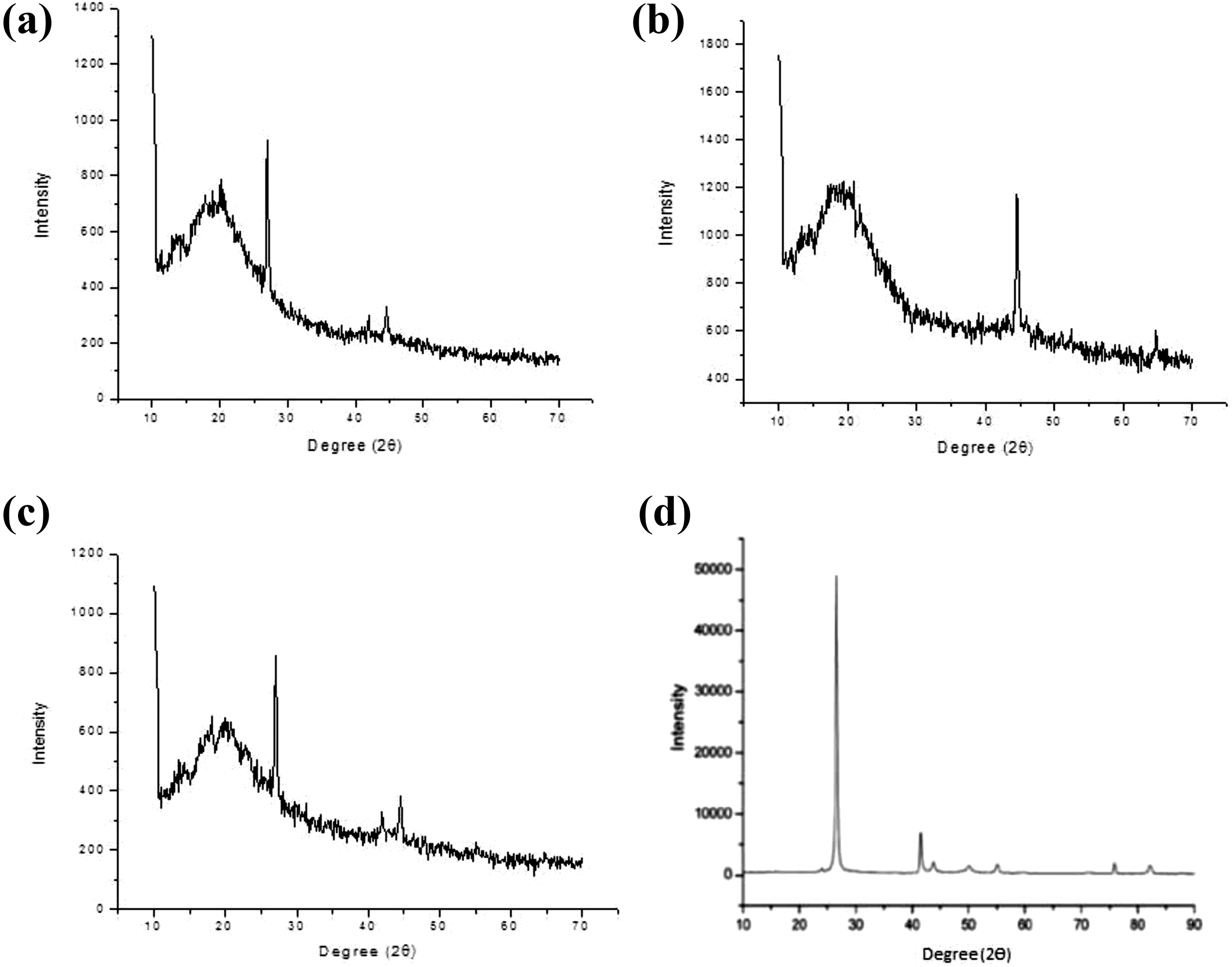 XRD pattern of (a) hBN-SPSU(Na)/PPEGMA(1:2), (b) SPSU(Na)/PPEGMA(1:2), (c) hBN-SPSU(Na)/PPEGMA(1:4), and (d) pure hBN.