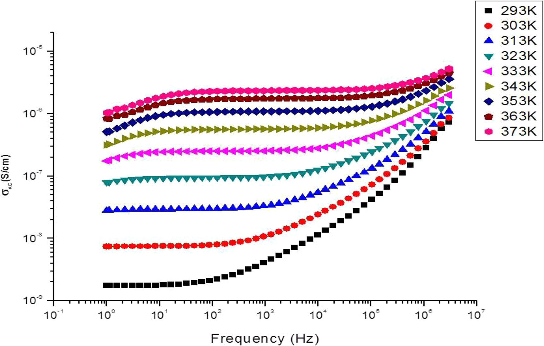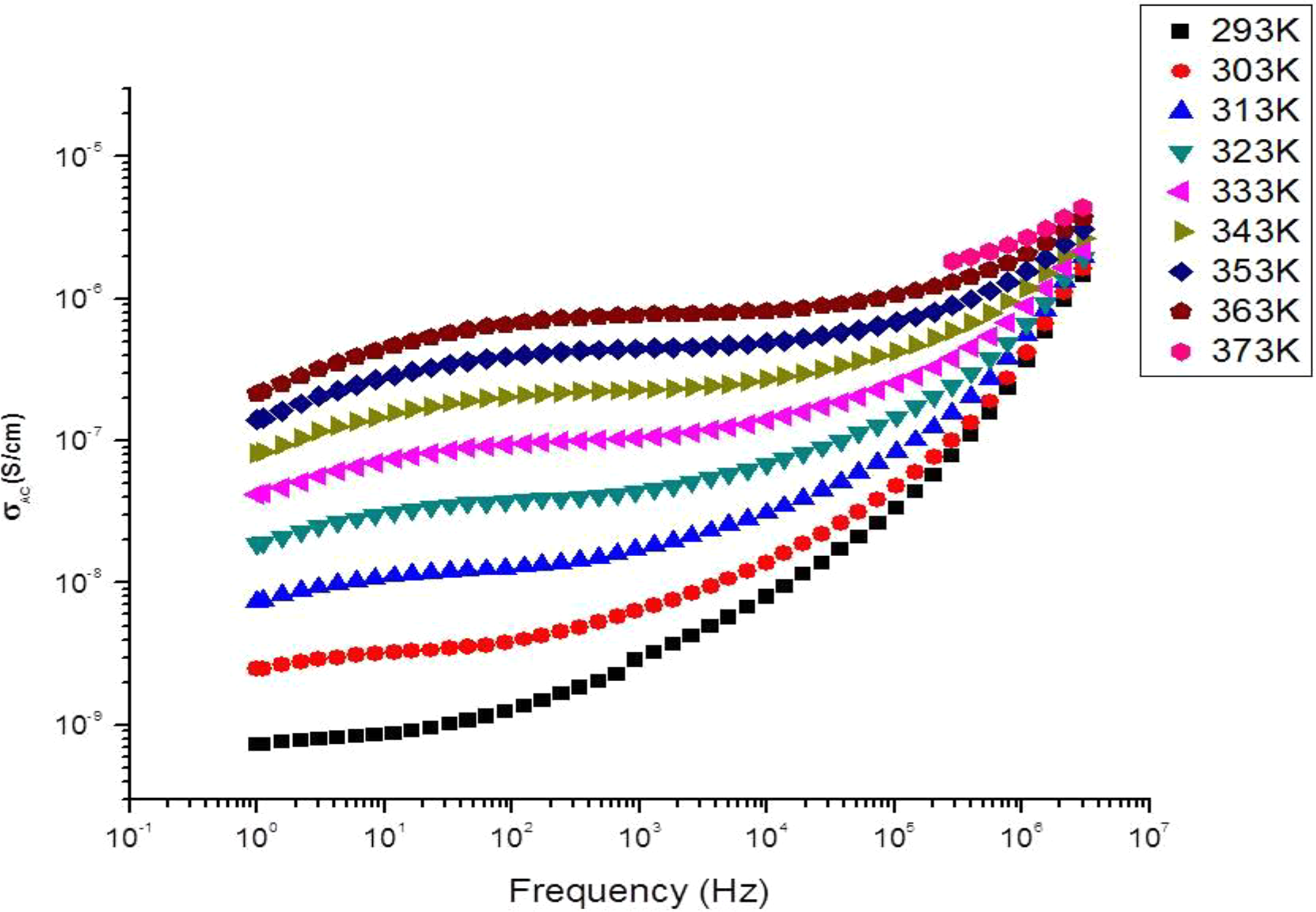 AC conductivity of SPSU(Na)/PPEGMA(1:4) versus log frequency (Hz) at various temperatures.