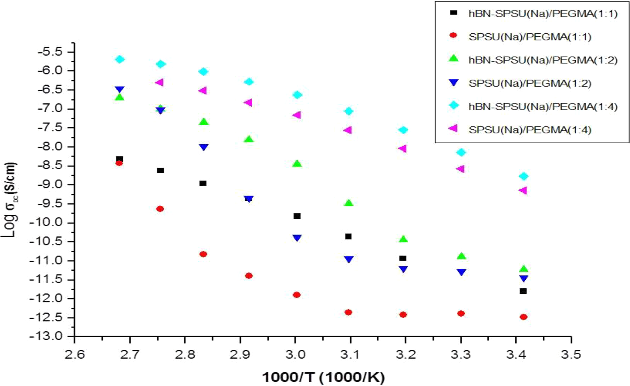 Conductivity of SPSU(Na)/PPEGMA(X:Y) and hBN-SPSU(Na)/PPEGMA(X:Y) composites as a function of reciprocal temperature.
