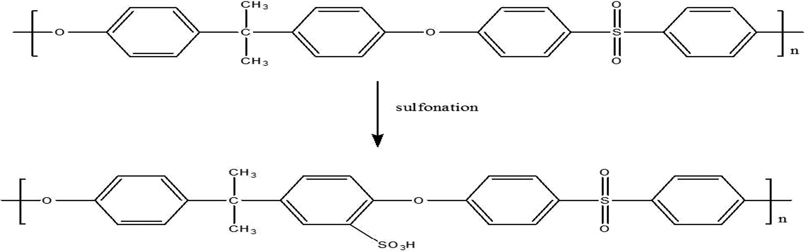 Sulfonated polysulfone (SPSU) was prepared in accordance with the literature. 15 PSU was placed in 1,2-dichloroethane at 25°C and stirred for 5 h under an N2 environment. TMSCS, the sulfonation agent, was introduced into the reaction flask at 25°C. During the reaction, N2 was continuously purged through the reaction flask, and hydrochloric acid (HCl) was continuously produced and released out of the reaction flask together with N2. After 36 h, methanol was added to quench the reaction and also to cleave the silyl sulfonate moieties yielding SPSU. Dichloroethane, methanol, and water were removed by evaporation. Sulfonation of PSU is shown in Figure 2.