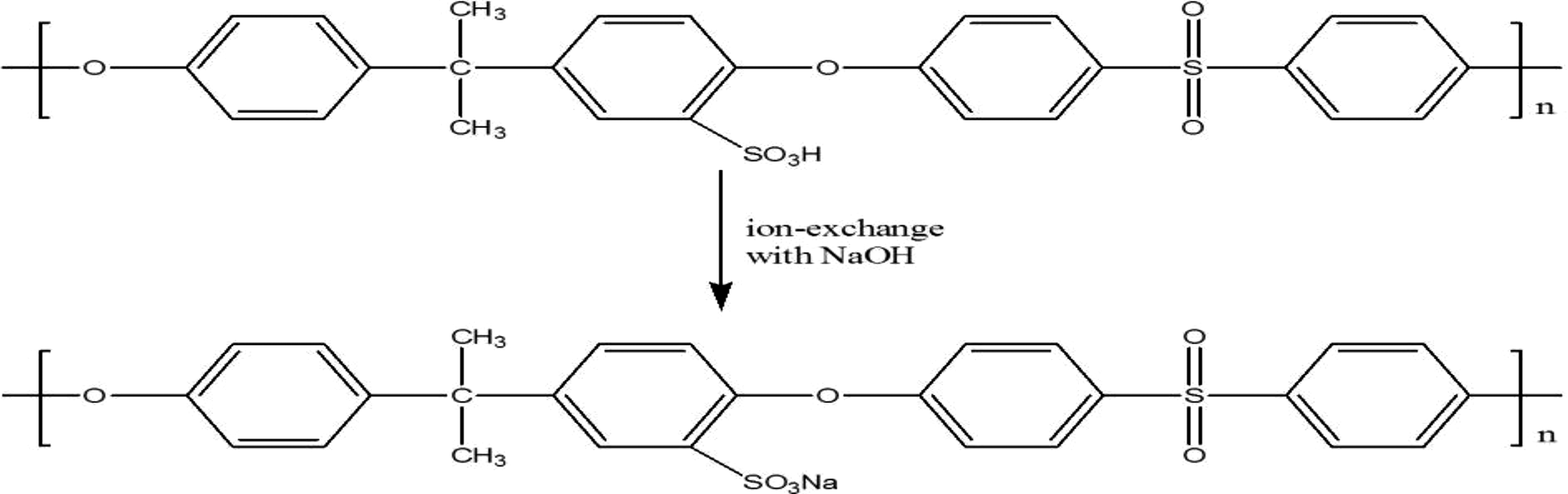 SPSU(Na) was prepared by ion exchange: SPSU was soaked in 0.1 M NaOH for 24 h followed by filtration. The filtrate was titrated with 0.1 M HCl using phenolphthalein as indicator. Figure 3 shows the ion exchange between SPSU and NaOH, and ion exchange capacity (IEC) was calculated using the equation below