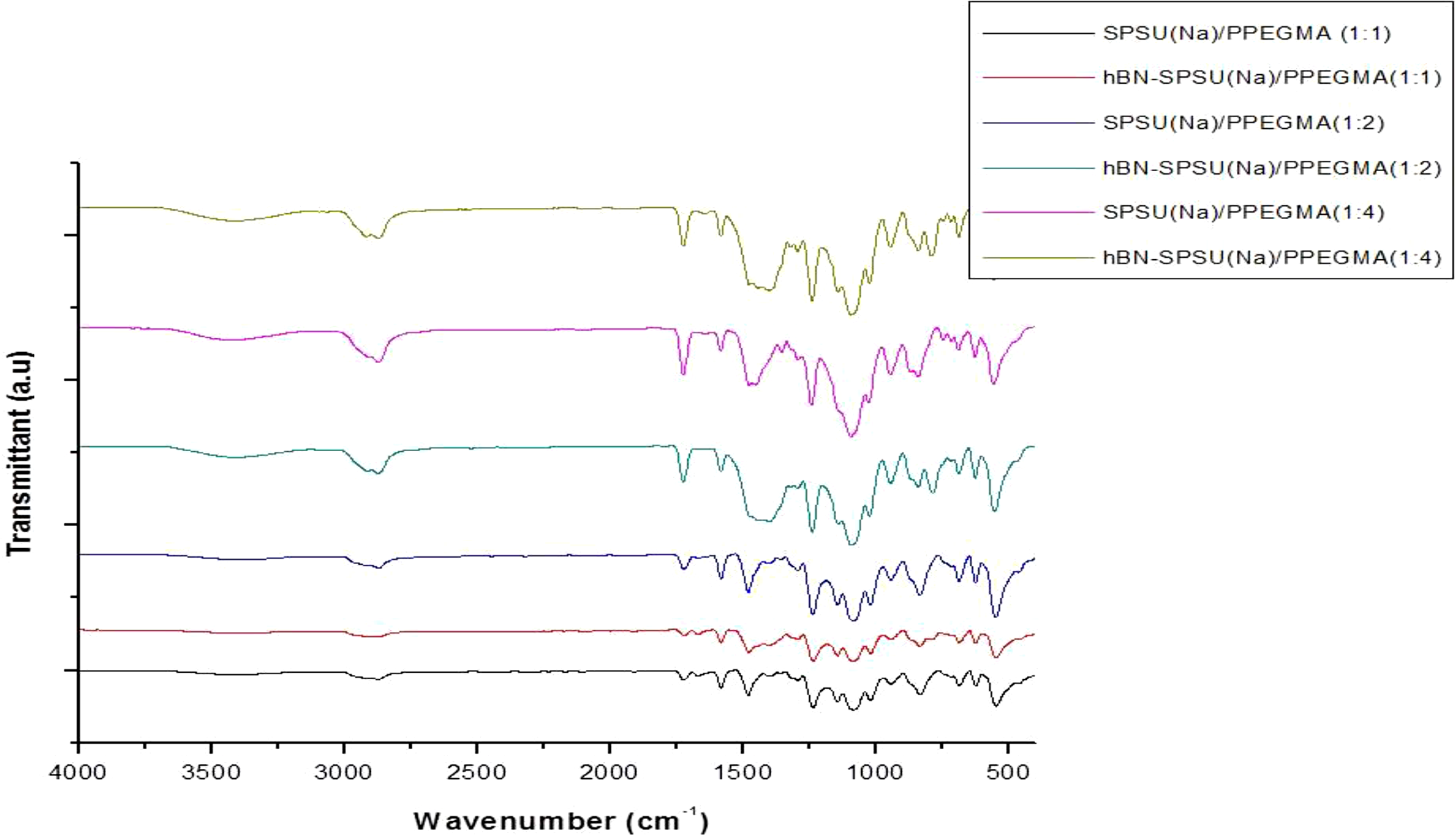 The SPSU(Na) to PPEGMA ratio can be estimated by comparing the C–O ether peak (1088 cm−1) intensity of the PEGMA. It can be seen from Figure 4 that the intensity of the peak at 1088 cm−1 increases as the PPEGMA content increased. And also, as the content of the PPEGMA increases, the O–H band becomes broader. Peak around 1336–1481 cm−1 broadens for samples with nano-hBN, which indicates the dispersion of the nano-hBN in the polymer blend because hBN has a characteristic broad band around 1336–1481 cm−1. 15