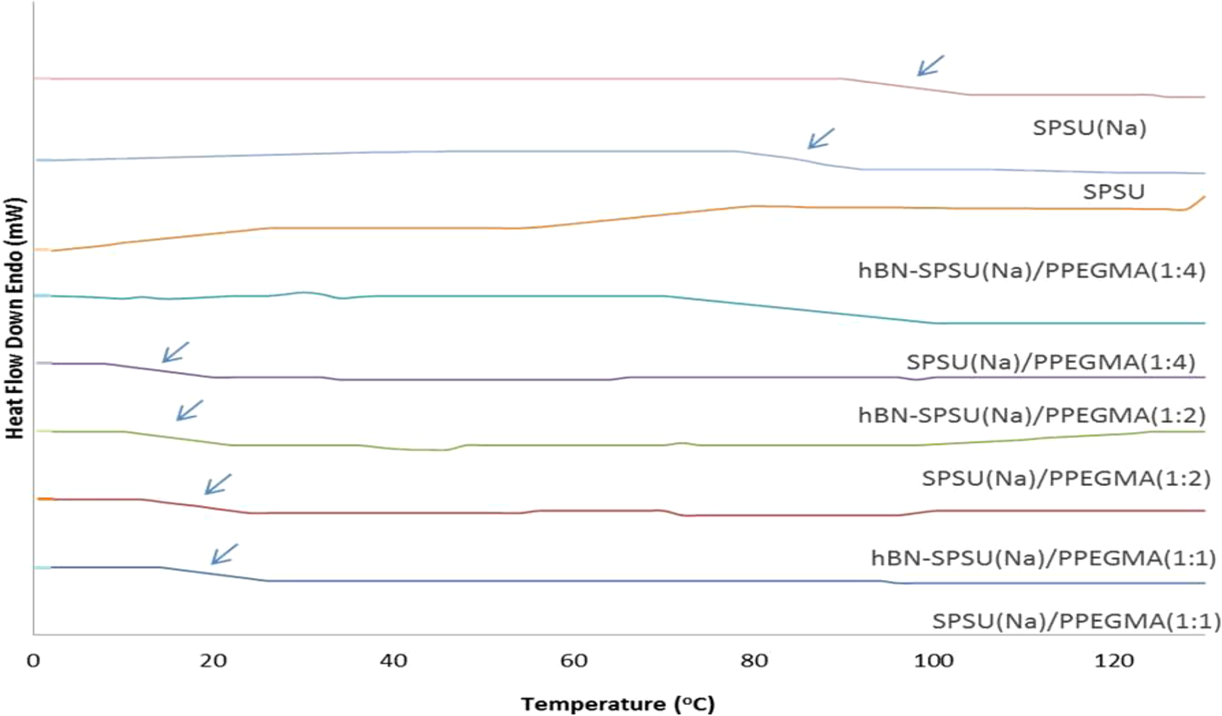 DSC analysis was performed under an inert atmosphere at a scan rate of 10°C min−1 by a heating–cooling–heating cycle and the second heating curves were evaluated. The second heating curves of SPSU(Na)/PPEGMA(X: ) and hBN-SPSU(Na)/PPEGMA(X:Y) samples are given in Figure 5. From the literature, neat PSU is reported to have