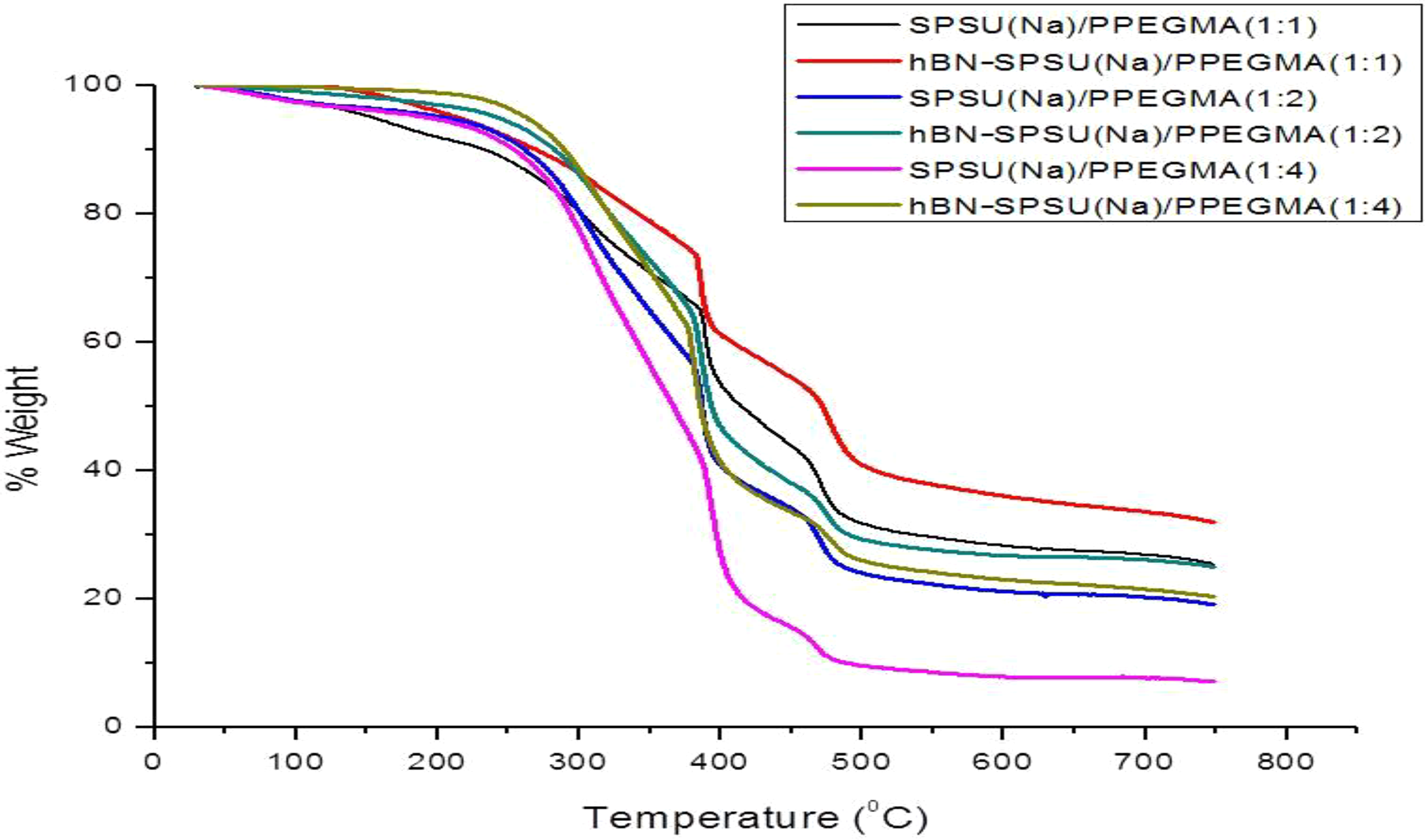 hBN-TGA gives information about the possible physical and chemical changes that may happen during a thermal excitation in a PE when it is applied to working systems. 17 The electrolyte should possess good thermal stability at high temperature to meet the criteria for application. Thermal stability of neat pure PPEGMA, SPSU(Na)/PPEGMA(X:Y), and hBN-SPSU(Na)/PPEGMA(X:Y) was evaluated by TGA. Prior to the measurement, the samples were dried under vacuum at 55°C for 24 h.