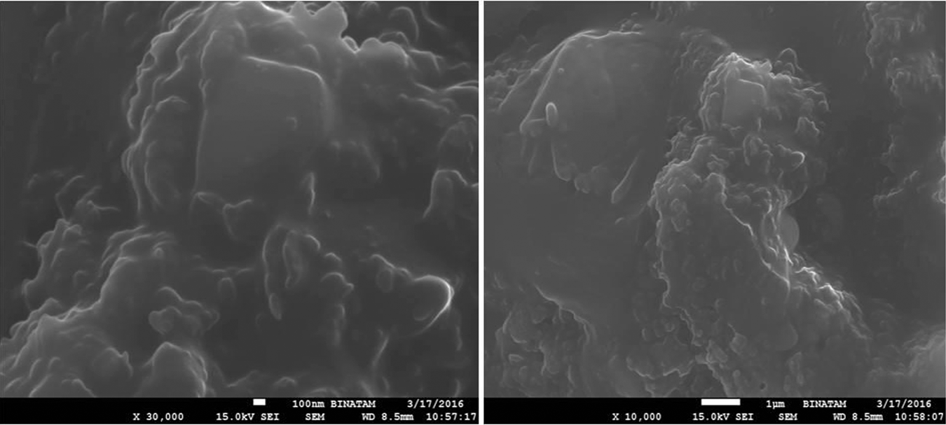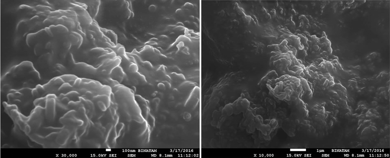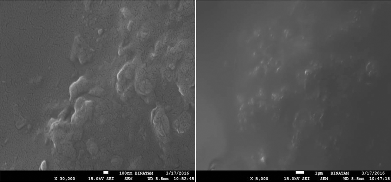 Surface morphology of the samples was examined by SEM, JEOL-7001 FESEM (Tokyo, Japan). Prior to the SEM measurements, all of the samples were coated with gold for 150 s in a sputtering device.