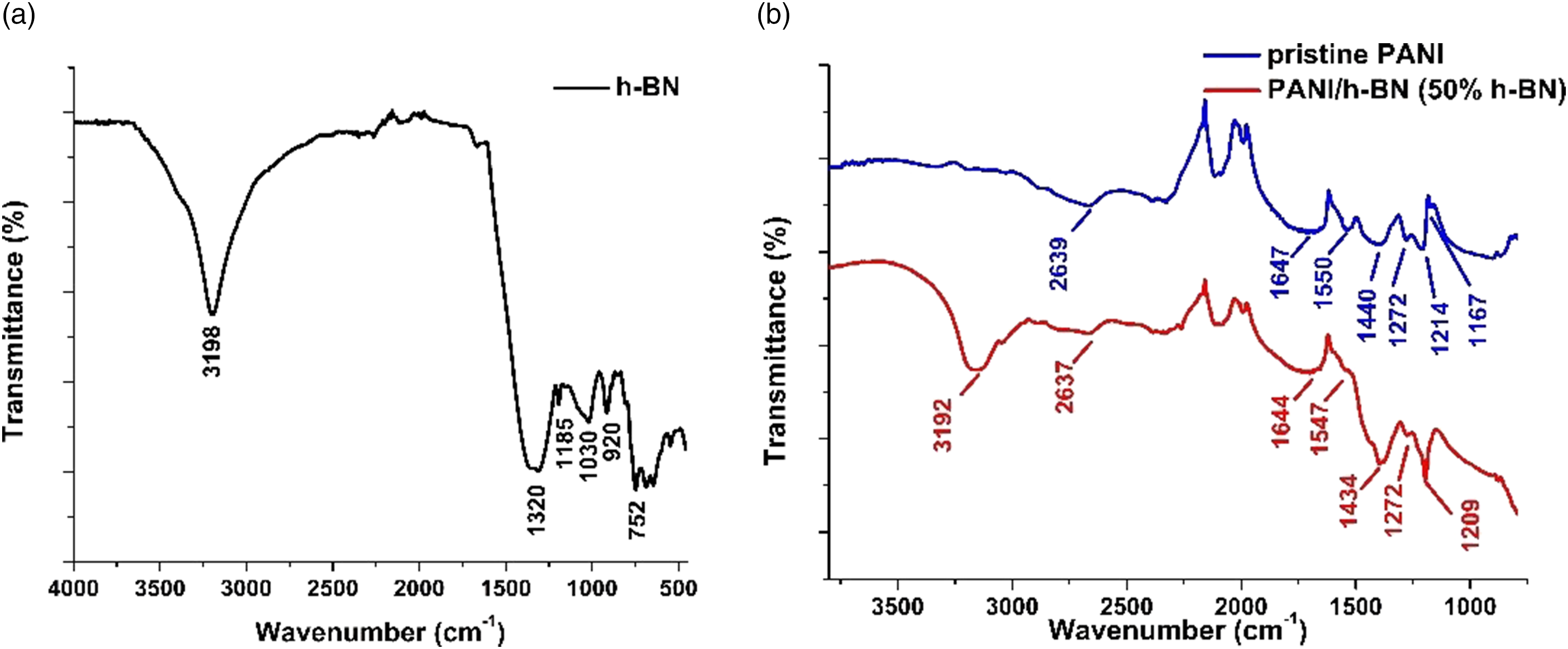 Fourier-transform infrared spectroscopy spectra of h-BN (a), Polyaniline-hydrochloric acid, and the composite with 50% h-BN (b).