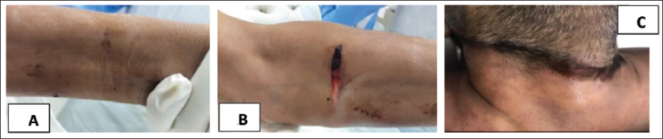 (A) Multiple Old Healed Hesitation Scar Marks. (B) Depicts an Incised Wound on the Forearm, With the Underlying Effusion of Blood. (C) Shows the Ligature Mark.