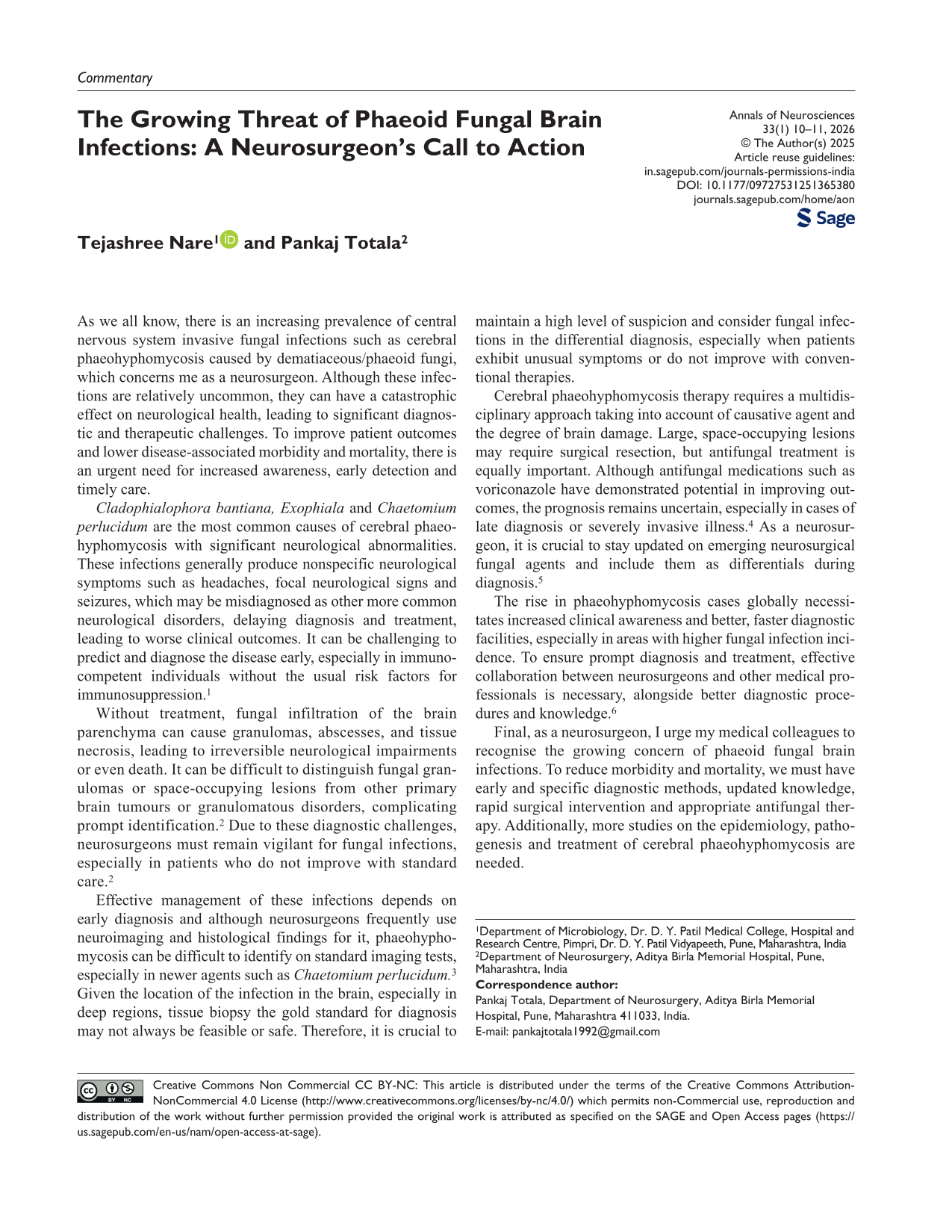 As we all know, there is an increasing prevalence of central nervous system invasive fungal infections such as cerebral phaeohyphomycosis caused by dematiaceous/phaeoid fungi, which concerns me as a neurosurgeon. Although these infections are relatively uncommon, they can have a catastrophic effect on neurological health, leading to significant diagnostic and therapeutic challenges. To improve patient outcomes and lower disease-associated morbidity and mortality, there is an urgent need for increased awareness, early detection and timely care.